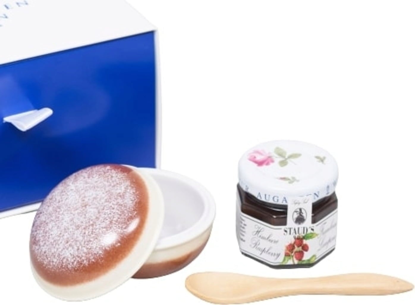 Az Augarten Vienna fánkdoboz porcelánból készül, a legkiválóbb kivitelezésben. Egy igazi fánkhoz hasonlít és elegendő helyet biztosít. Az ajándékszettben a bambuszból készült fakanál mellett egy kis üveg baracklekvár is megtalálható.