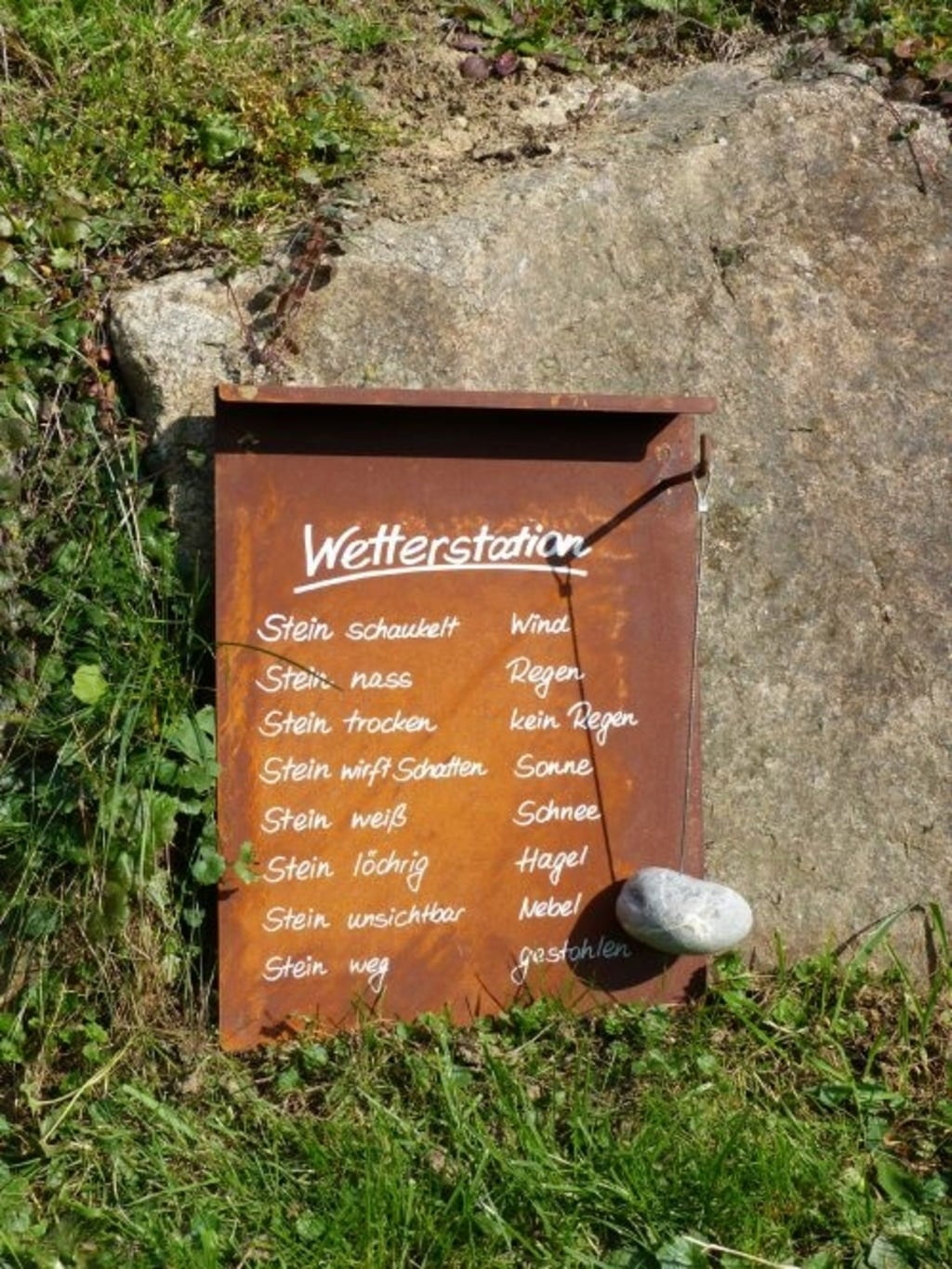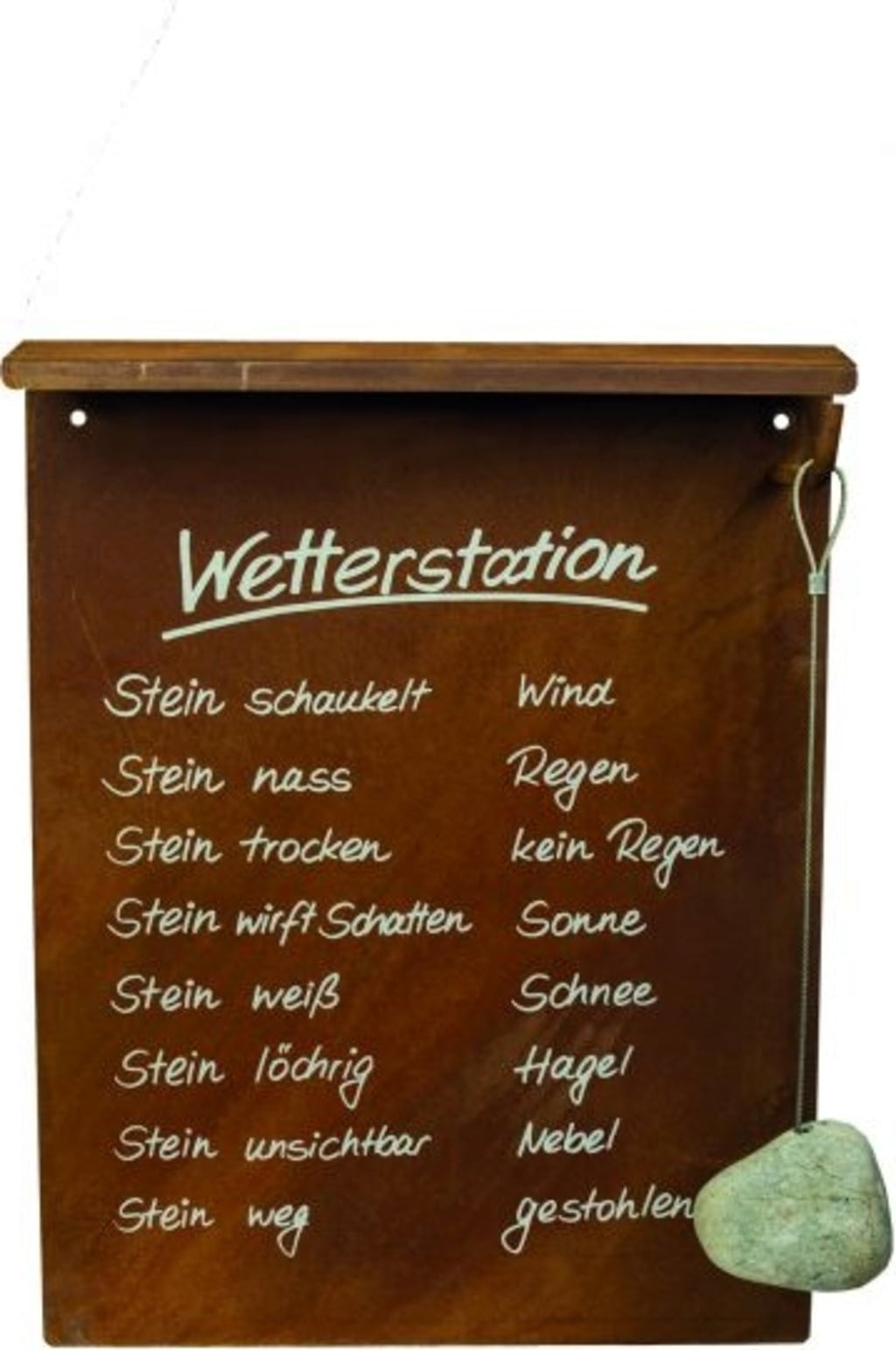 Ezzel a meteorológiai állomással többé nincs kiszolgáltatva a hirtelen időjárási változásoknak, mindig felkészült lehet a napsütésre, hóra, jégre és esőre. A kő minden időjárási jelentésnél megbízhatóbban ad tájékoztatást az aktuális időjárásról, és egy kacsintással megnevetteti Önt és látogatóit egyaránt.