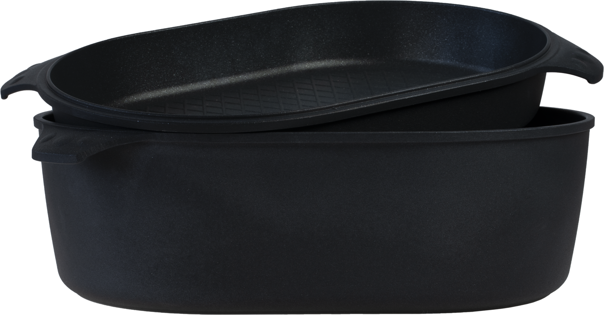 Teljes sütőedény 40 x 28 cm, magasság 13 cm, űrtartalom 9,8 L, alj 34 x 22 cm, súly 6 kg