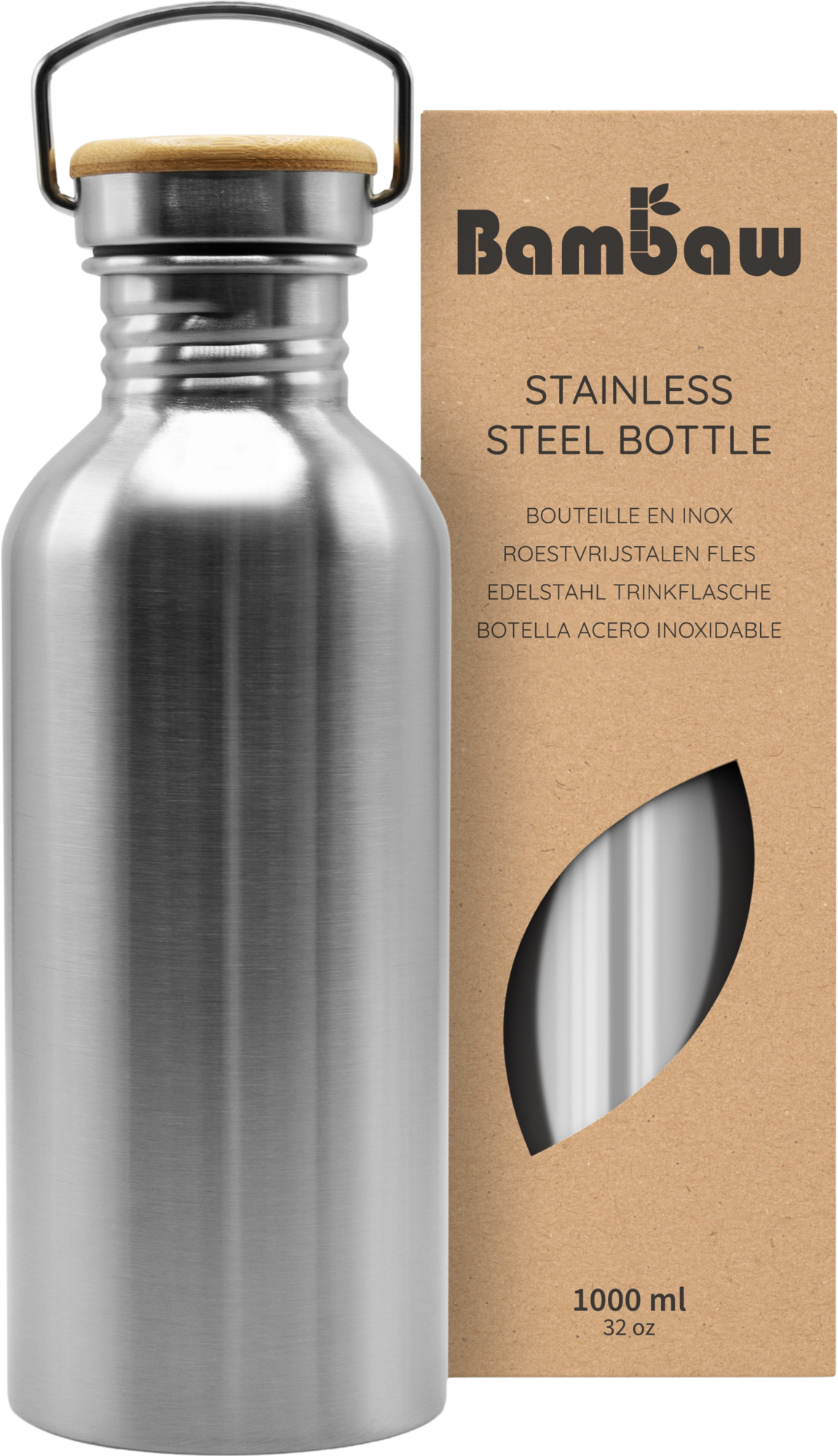 Bambaw Rozsdamentes acél palack, 1000 ml, Natural Steel