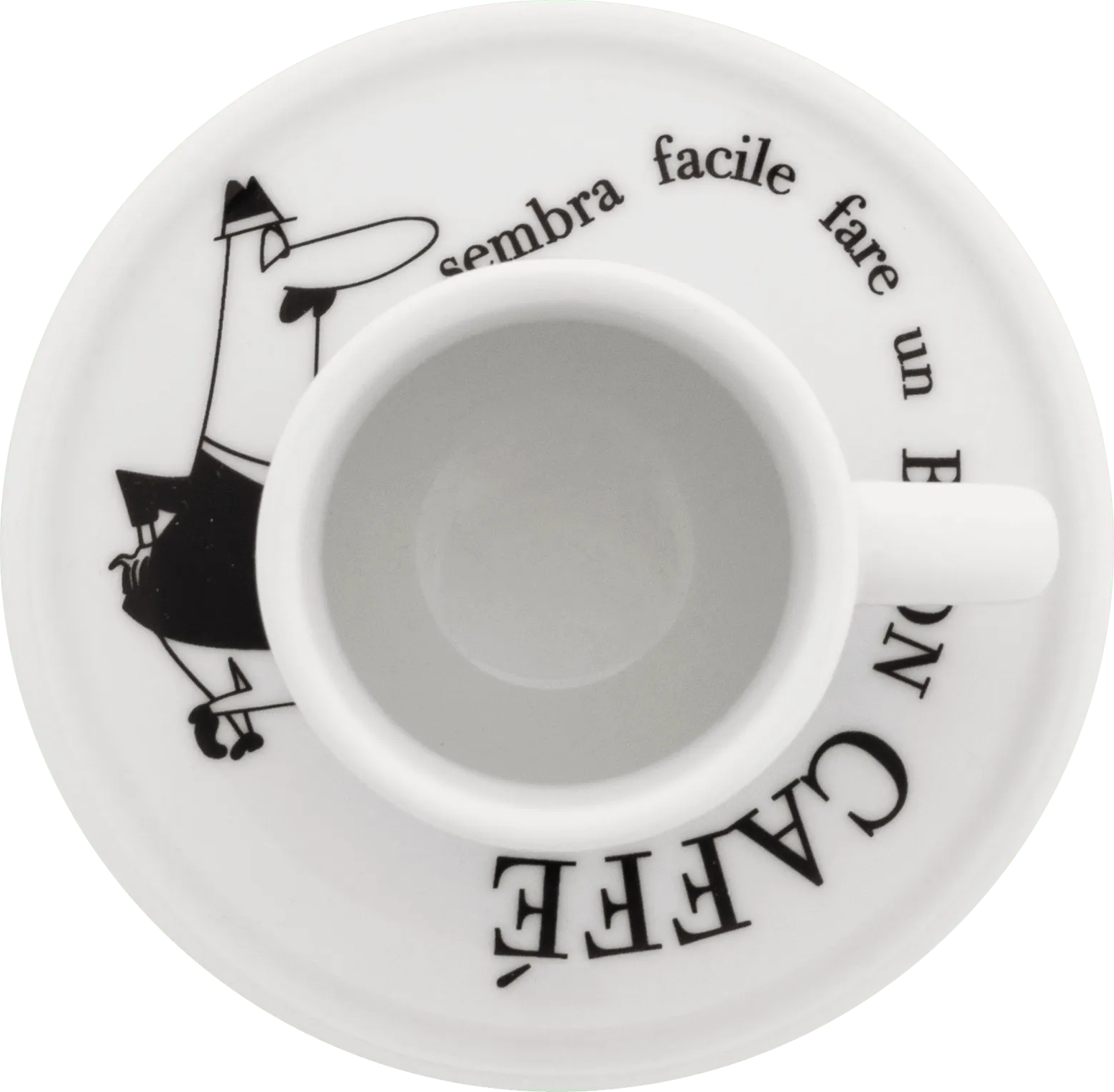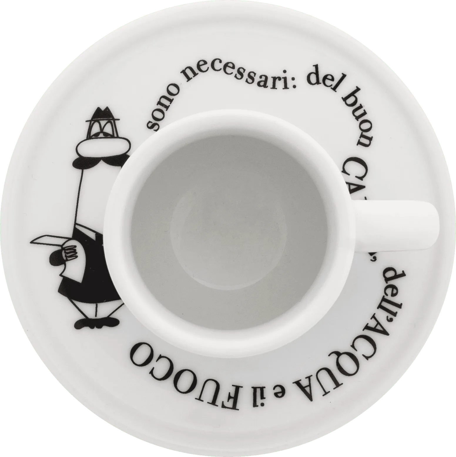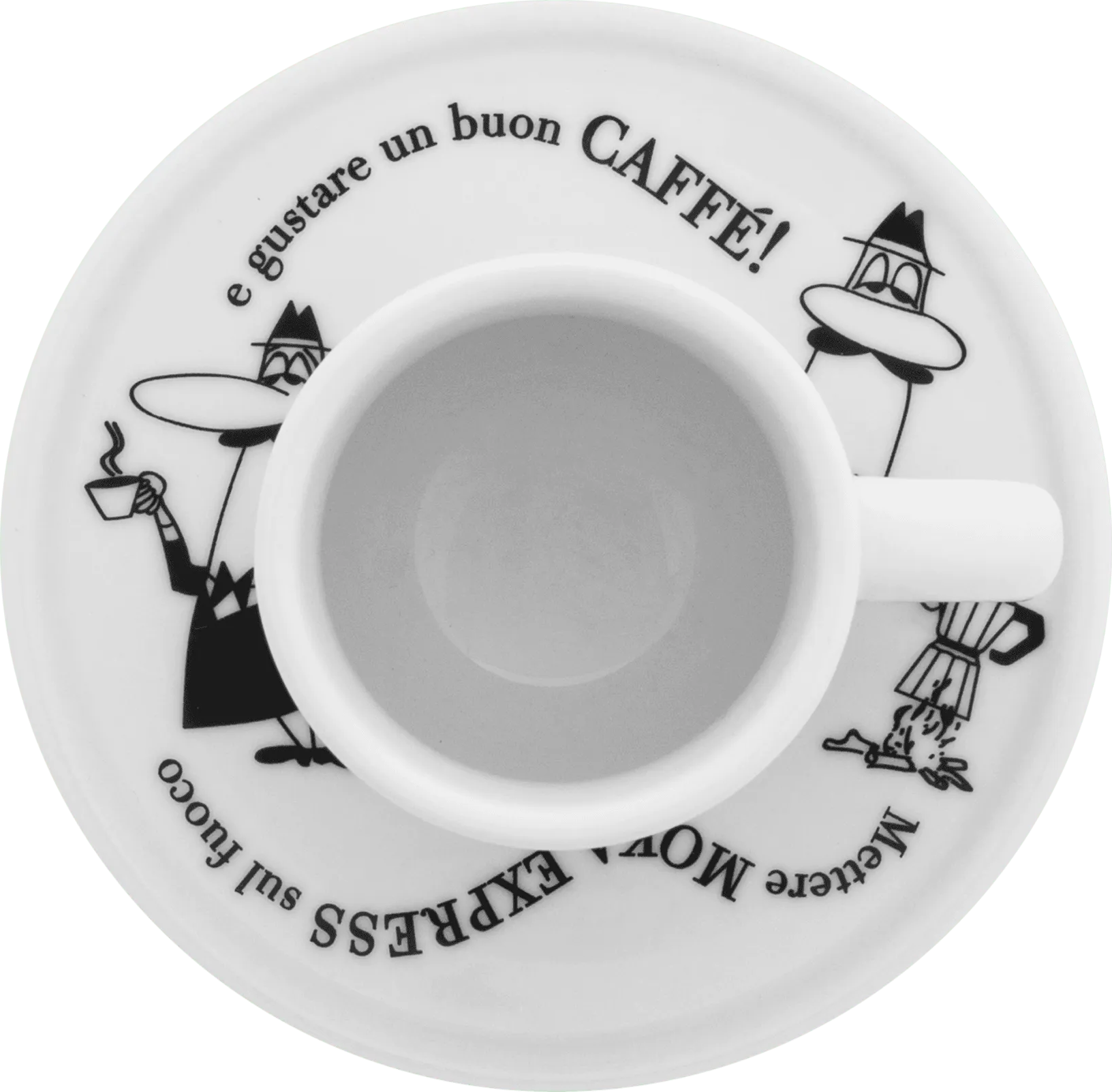 Az ikonikus Bialetti logoval díszített espresso csésze szett a csészék alátétein mutatja be a kávékészítés fázisait.