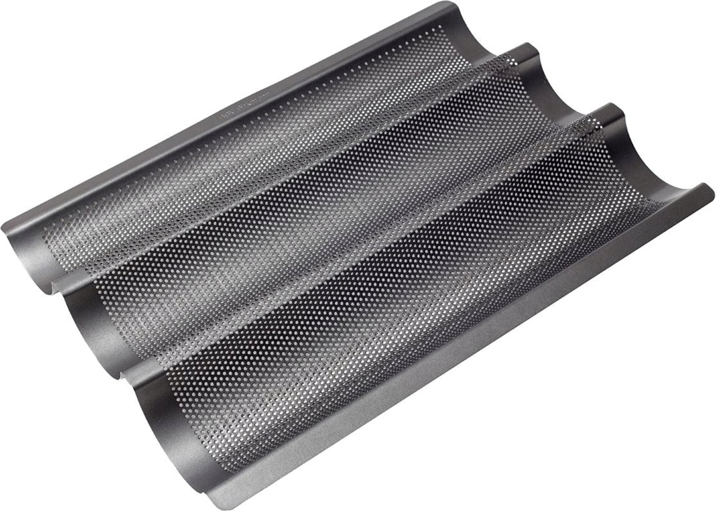 Speciálisan perforált tepsi, amelyen három ropogós bagett (250 g - 300 g) süthető. A lemez különleges jellegének köszönhetően egyenletes hőeloszlást biztosít. Így a bagettek különösen ropogós kérget kapnak, mintha csak Franciaországban sütötték volna azokat. A kiváló minőségű tapadásmentes bevonat pedig a bagettek könnyű, tapadás nélküli eltávolításáról gondoskodik. A tepsi kiváló minőségű díszdobozba csomagolt.