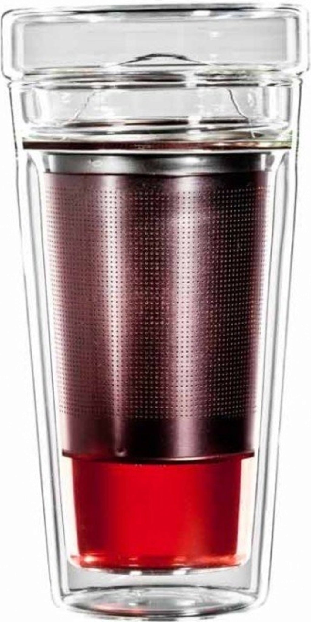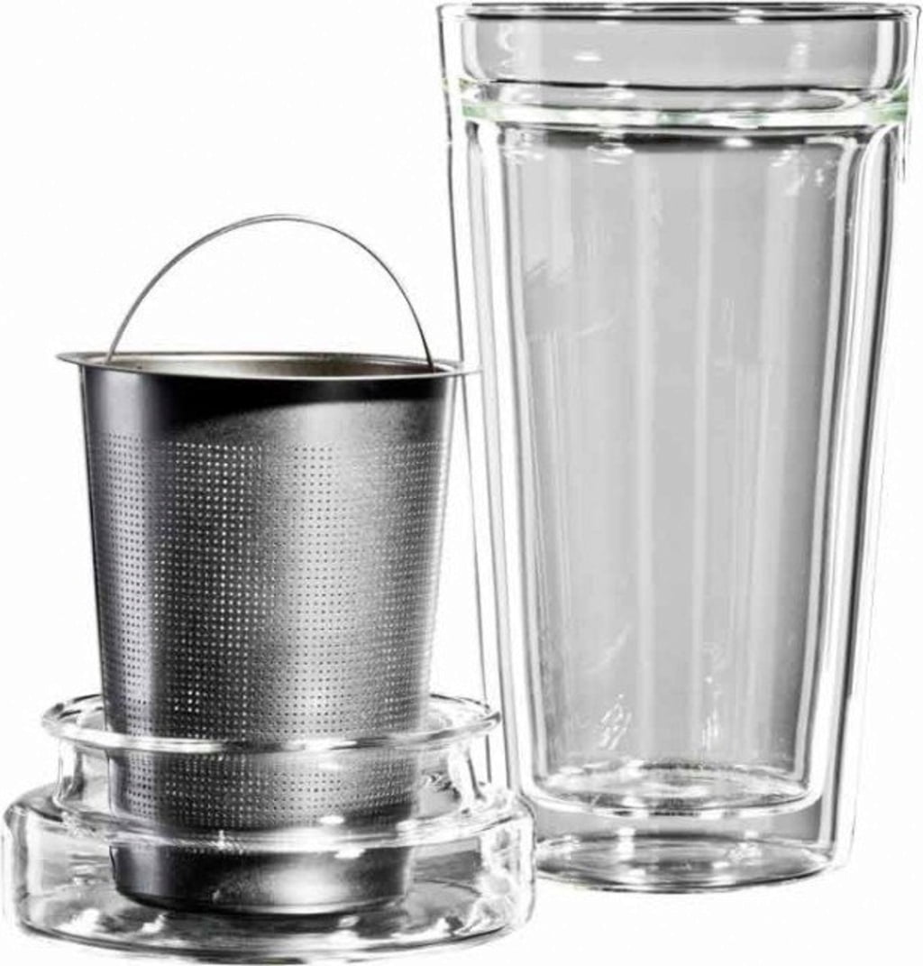 Ideális személyes tea-rituáléhoz. A szett egy karcsú teás pohárból, egy fogantyús nemesacél szűrőből és egy üvegfedélből áll. Duplafalú.