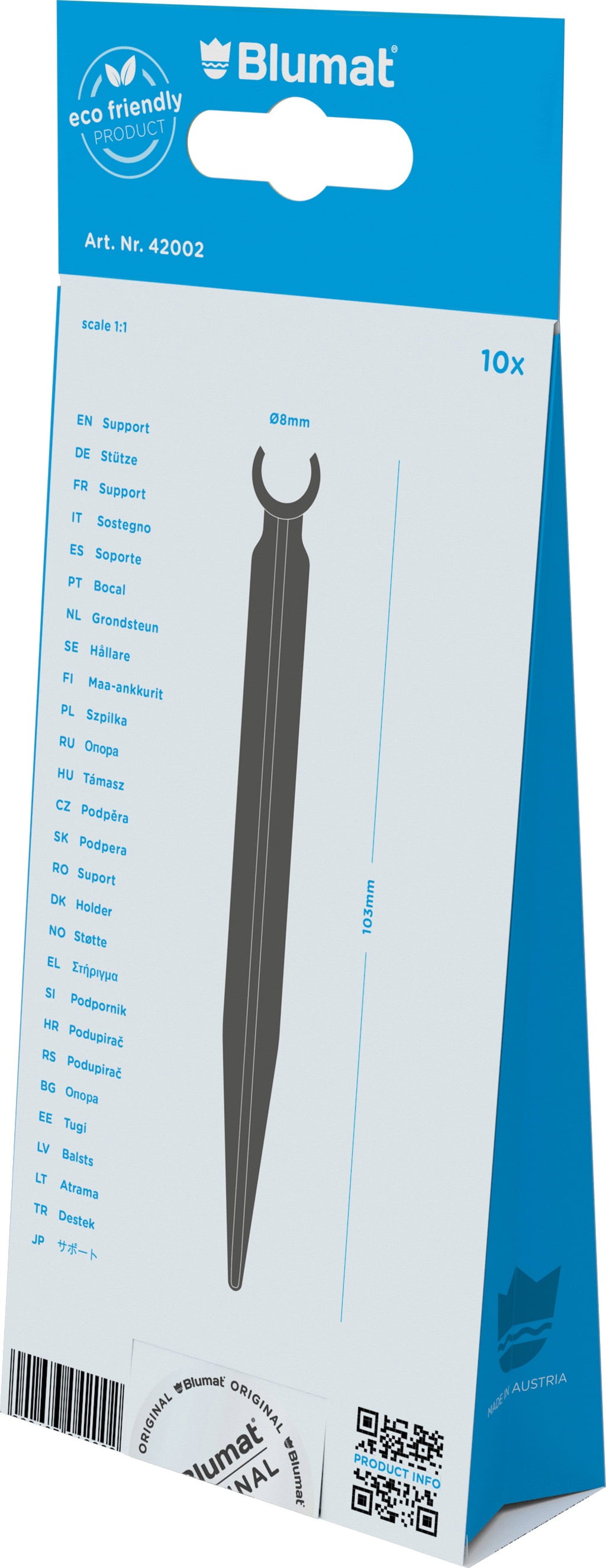A Blumat tartókonzolok alkalmasak a Blumat fővezeték rögzítésére, illetve a csepegtető lánc vagy egyedi csepegtetőfúvókák távtartójaként. Ez megakadályozza a talajjal való közvetlen érintkezést, és így megakadályozza a túlzott szennyeződést vagy a gyökerek általi eltömődést.