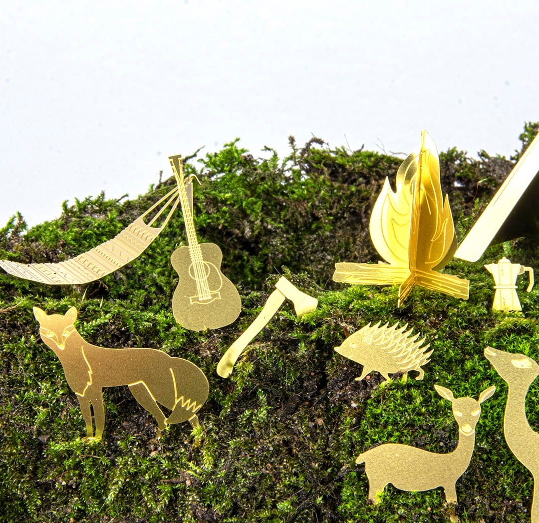 - Sátor, kenu, tábortűz kávéfőzővel, mályvacukor és fejsze, távcső, gitár, harkály, medve, két szarvas, sündisznó, béka, róka és nyúl.