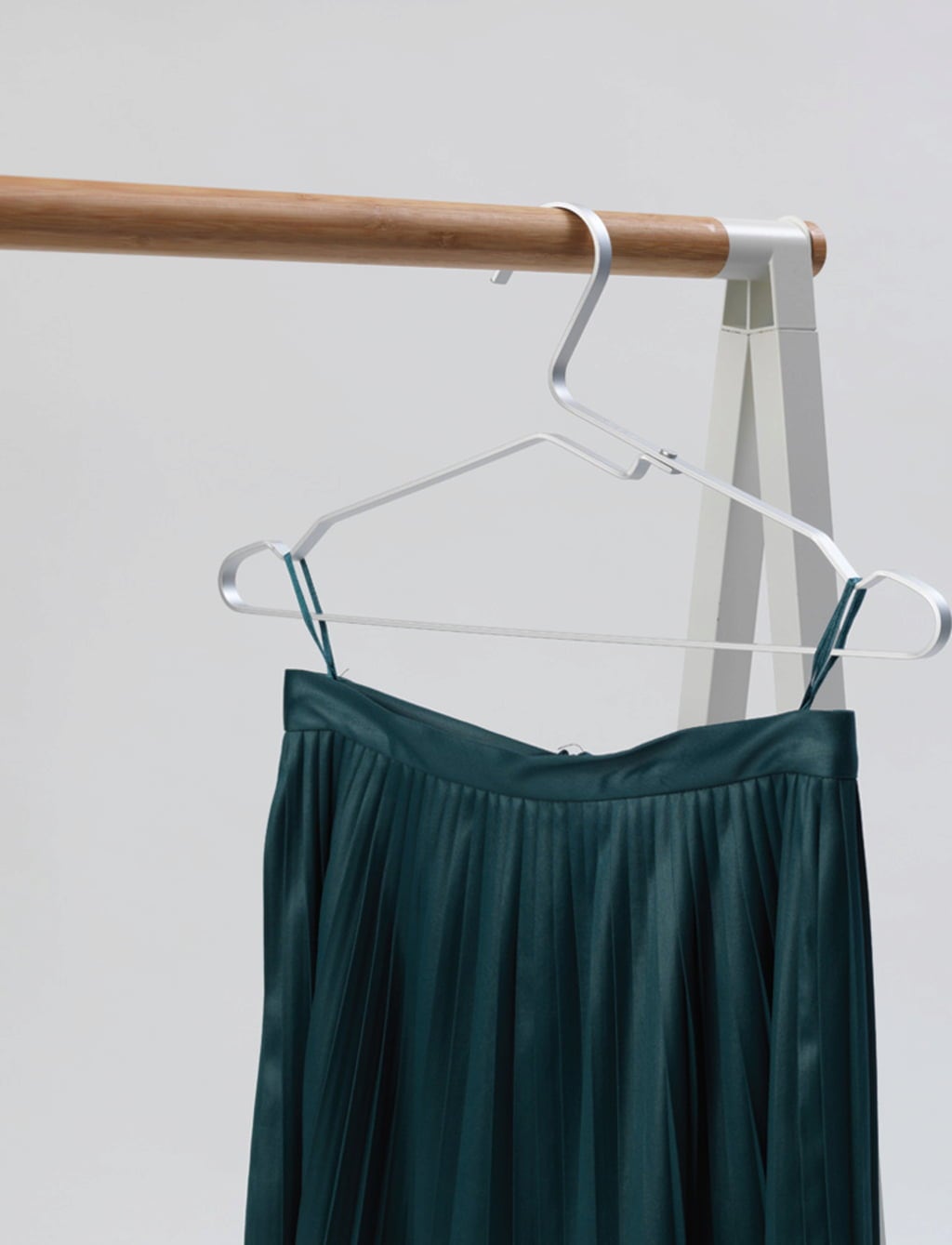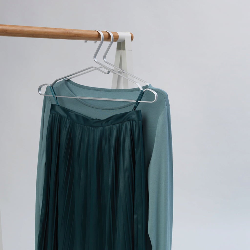 Az okosan ívelt vállfa lehetővé teszi a pólók, pulóverek vagy akár begombolható ingek könnyed felakasztását az anyag megnyújtása nélkül. Tartós, eloxált alumíniumból készült, és az oldalsó okos bevágásoknak köszönhetően ezek a vállfák tökéletesek blúzok és akasztós ruhák számára is.