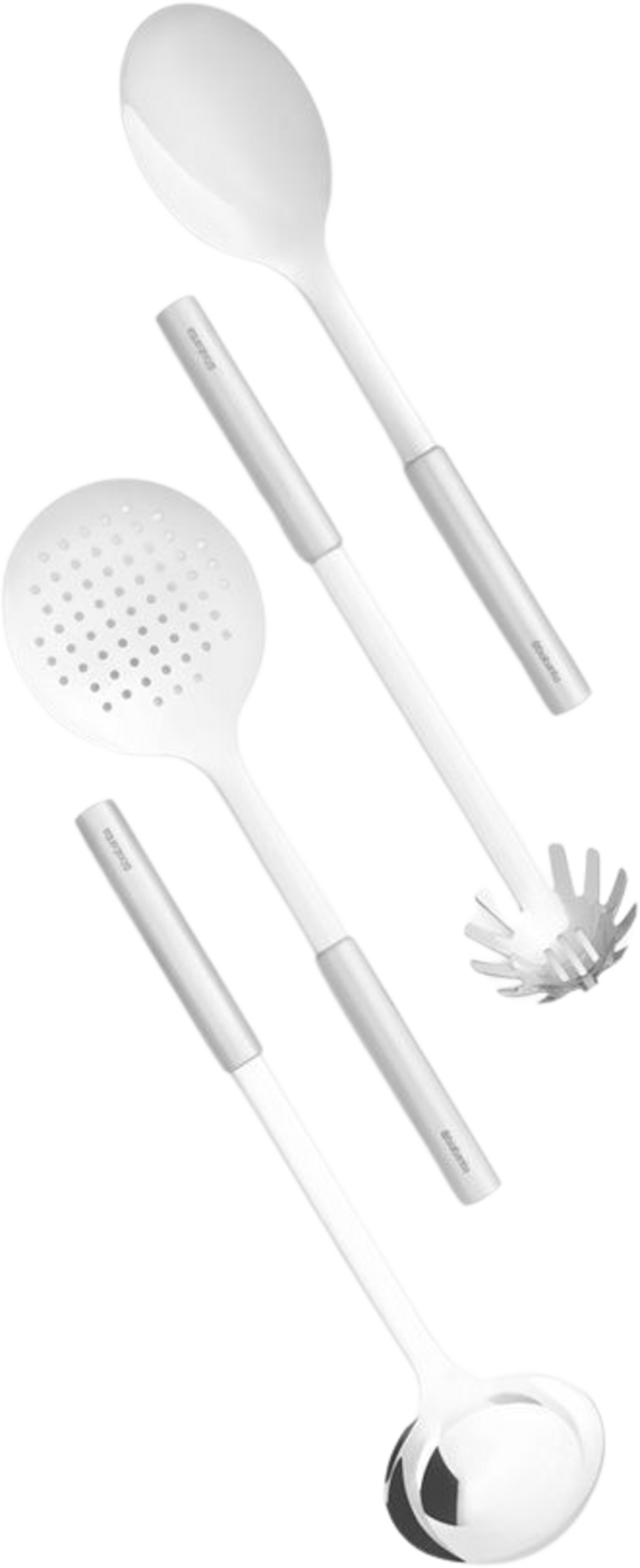 A legfontosabb és legnépszerűbb konyhai eszközök egy készletben - leveses merőkanál, zöldségkanál, spagettis kanál és szűrőkanál.