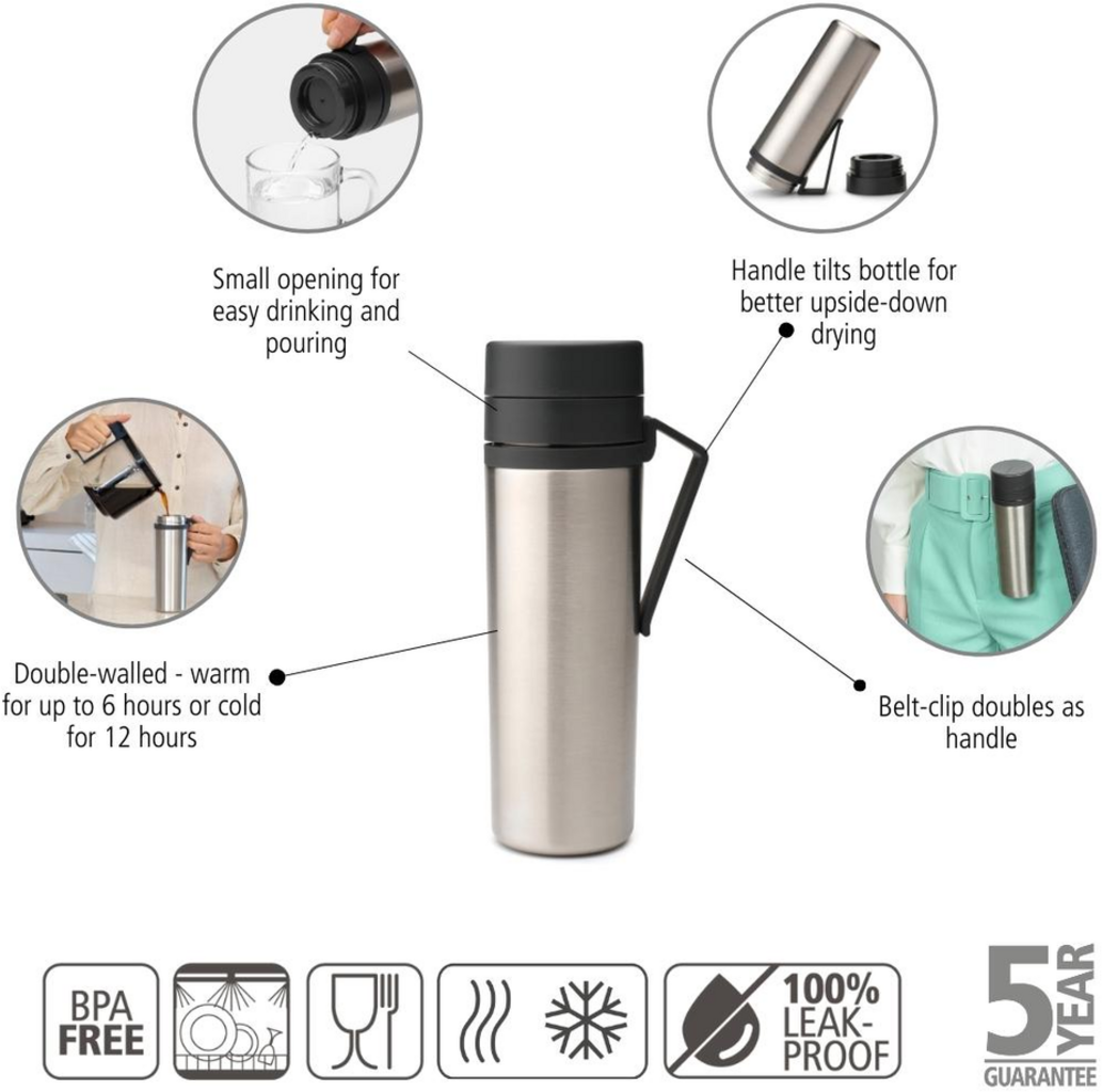 A szivárgásmentes palack a kávét vagy a teát akár 6 órán keresztül melegen, valamint az italokat 12 órán át hidegen tartja. Ötletes kialakításuk könnyű ivást és öntést tesz lehetővé a kis nyílásnak köszönhetően. Mosogatógépben egyszerűen megtisztítható.