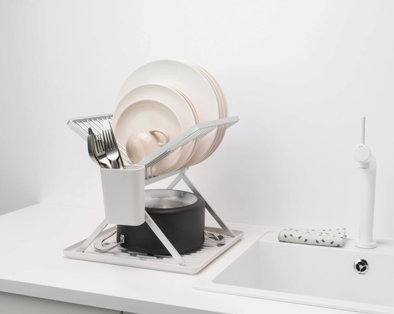 Különösen praktikus: a készlethez tartozó cseppfelfogó tálca az állvánnyal együtt vagy külön-külön is használható, és bordái az optimális szellőzésnek köszönhetően gyors száradást biztosítanak.