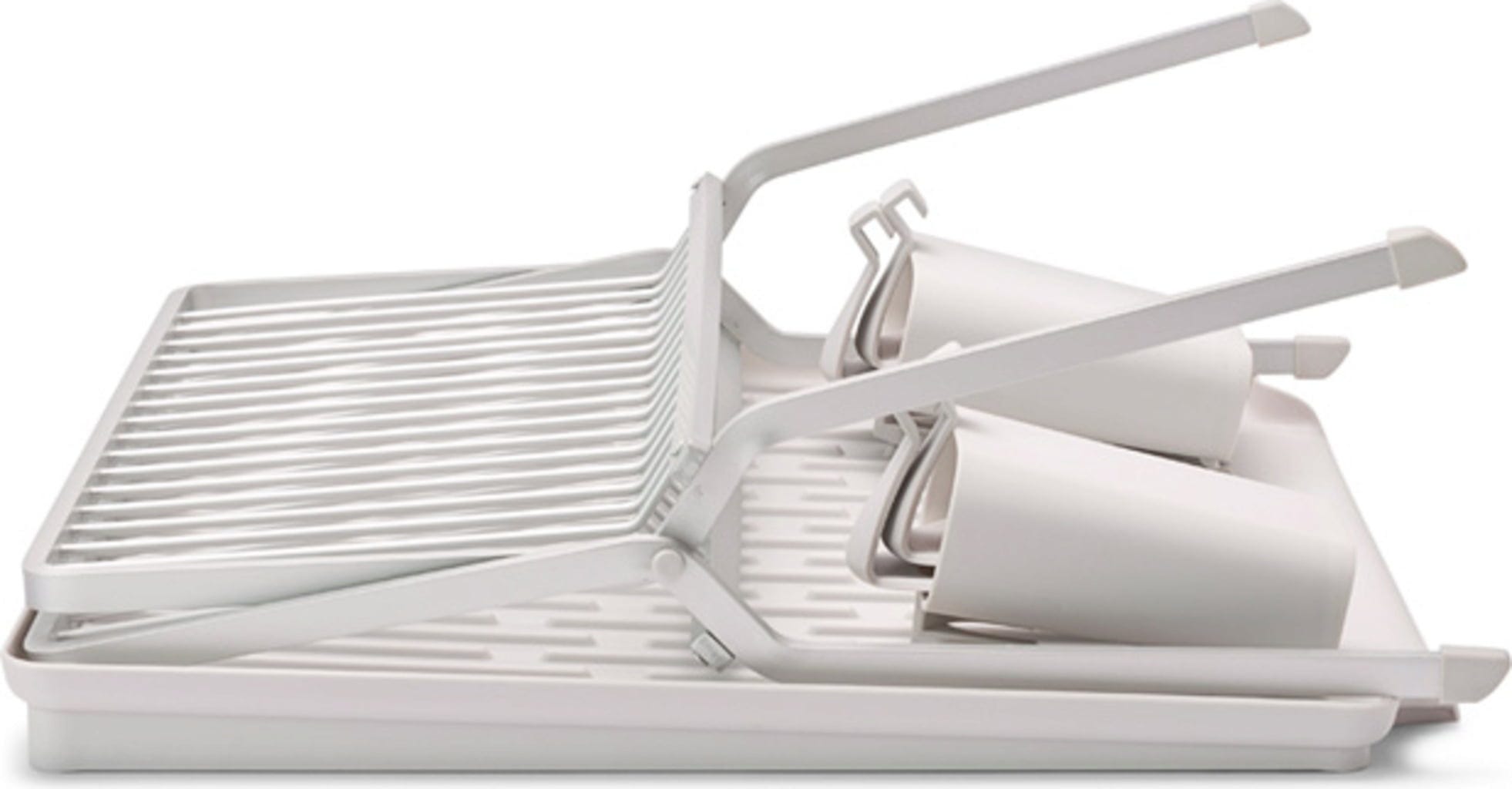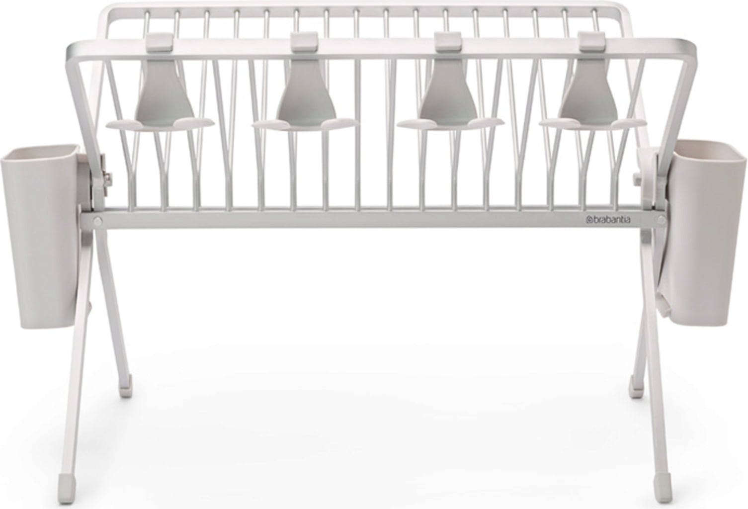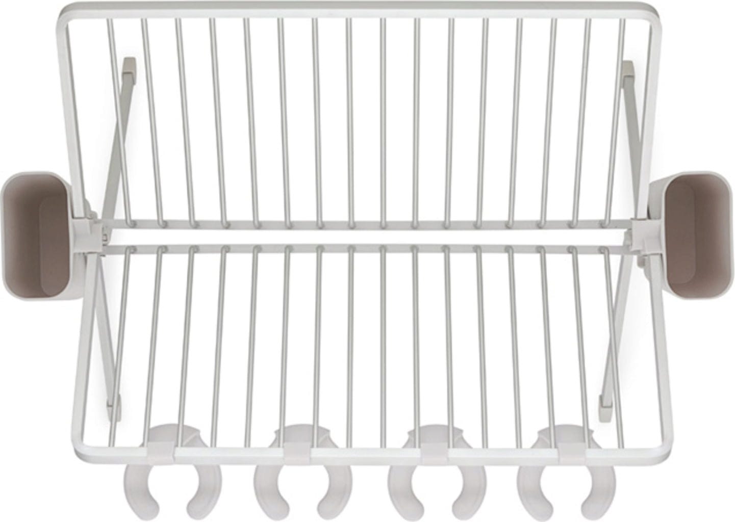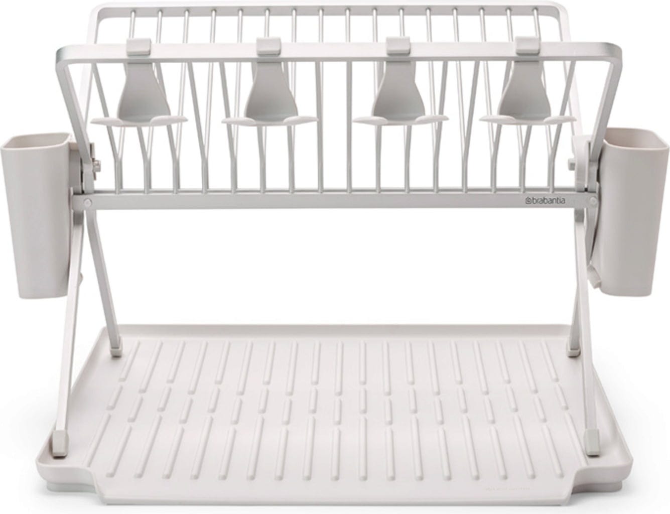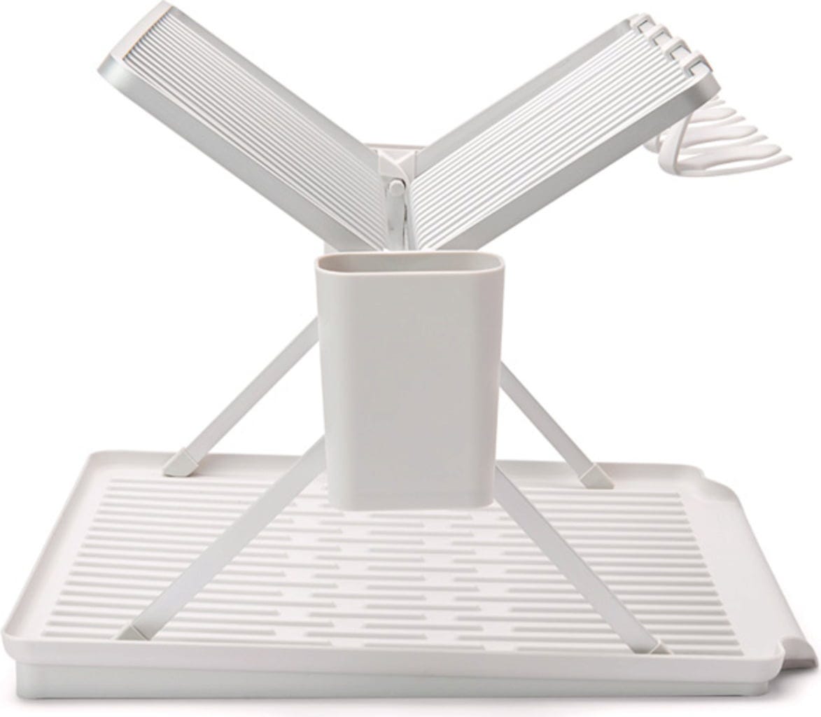 Ez a praktikus és vizuálisan is tetszetős alumínium csepegtetőállvány bordázott műanyag tálcával és két kivehető evőeszközkosárral szinte túl jó ahhoz, hogy összecsukja. Ennek ellenére pillanatok alatt összecsukható és kompakt módon elpakolható. Akár 17 tányérnak is helyet kínál, valamint az edények, serpenyők és poharak is jól érzik magukat benne. Utóbbiak a négy praktikus kampóra biztonságosan felakaszthatók.
