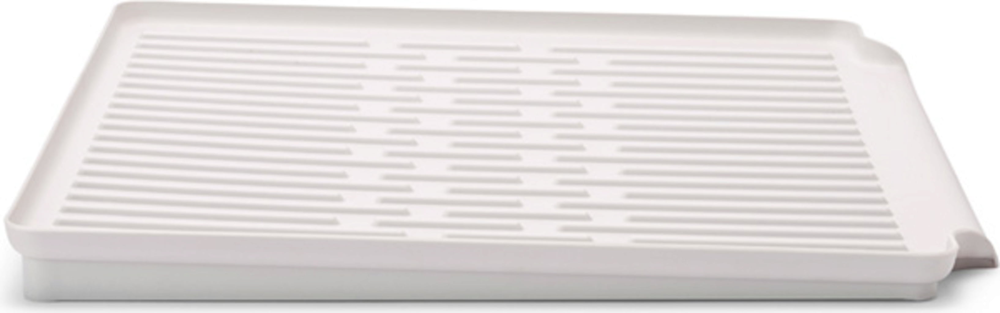 A készlethez tartozó cseppfogó tálca az állvánnyal együtt vagy külön-külön is használható. Enyhe lejtésének és vízelvezető nyílásának köszönhetően a vízmaradványokat közvetlenül a mosogatóba vezeti, bordái pedig az optimális szellőzésnek köszönhetően gyors száradást biztosítanak.