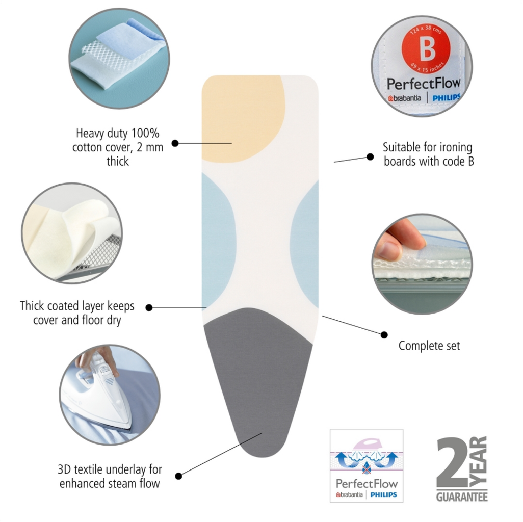 - Tökéletes illeszkedés a Brabantia B vasalódeszkájához (124 x 38 cm) a húzózsinórnak és stretch-rendszernek köszönhetően