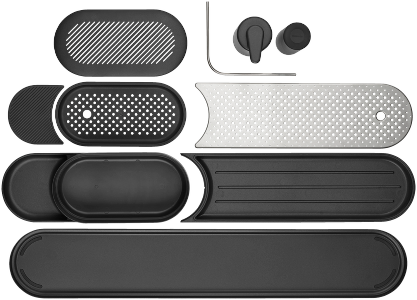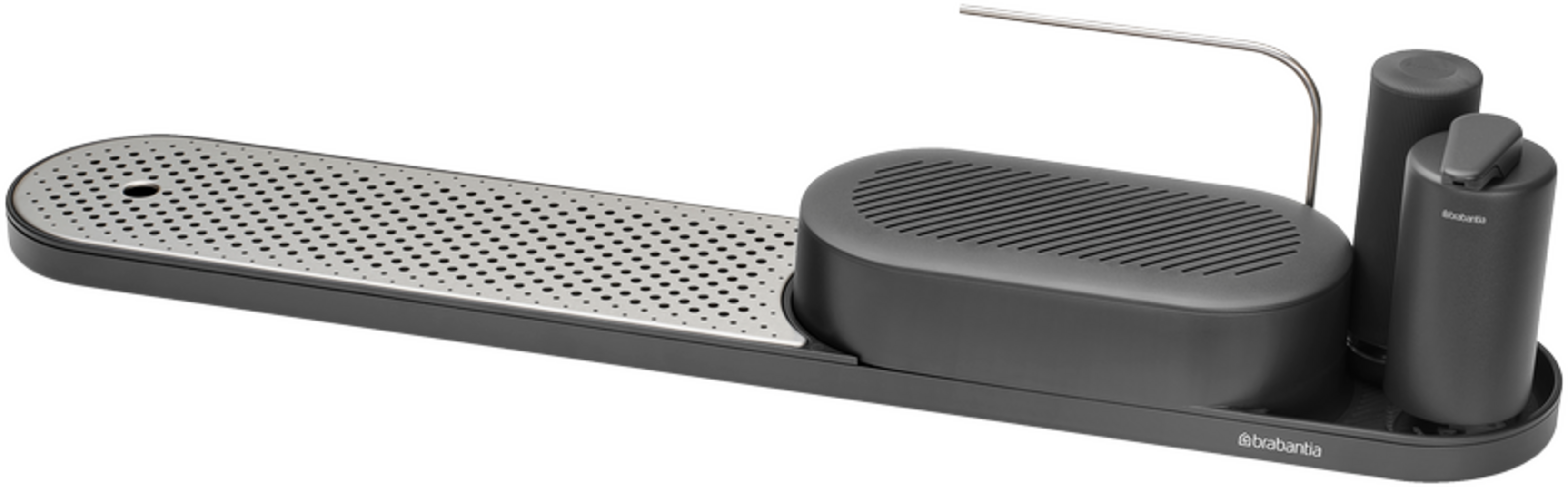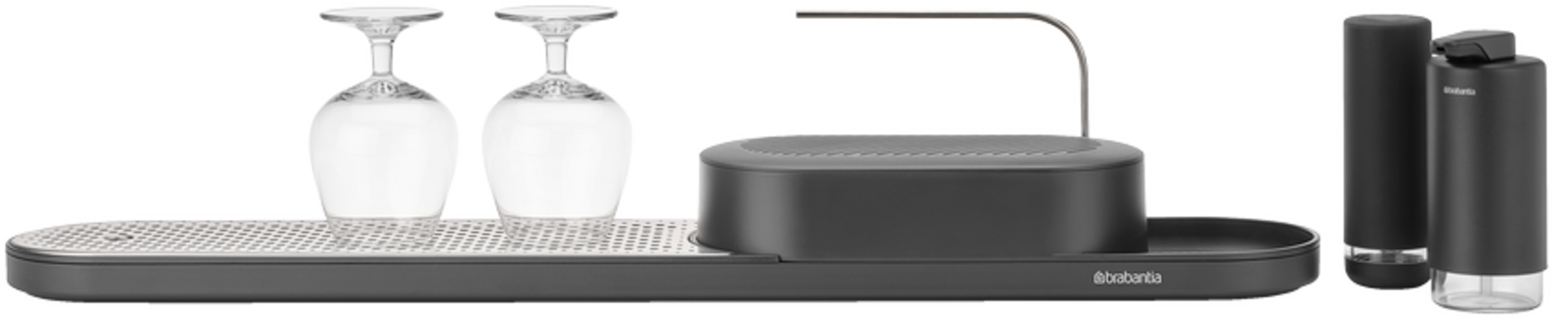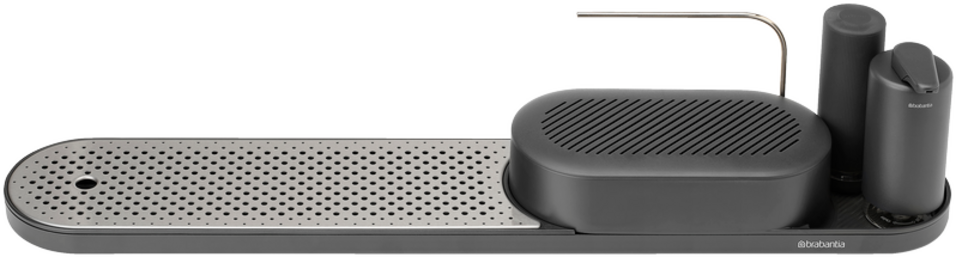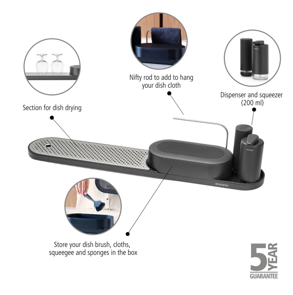 Ez a stílusos és okos rendszerező a munkaterületet mindig rendben és tisztán tartja. A szárítóból, tárolóból, szappanadagolóból, nyomós szappanadagolóból és mosogatókendő-tartóból álló szett moduláris felépítésének köszönhetően többféleképpen használható, illetve elegendő helyet kínál a szivacsok, konyharuhák, kefék és egyebek tárolására. A nemesacél fedelű szárító ideális poharakhoz, barázdált talpa pedig biztos állást garantál.
