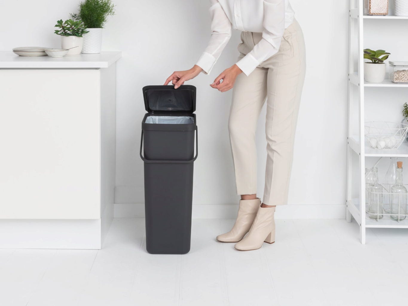 Tökéletes palackok, dobozok és műanyag csomagolások számára. Ez a stílusos és praktikus szemetes a Brabantia "Sort & Go" termékcsaládjából 40 literes űrtartalmú újrahasznosítható hulladék gyűjtésére. A felnyitható fedél levehető, míg a masszív fogantyú egyszerű és kényelmes szállítást biztosít.
