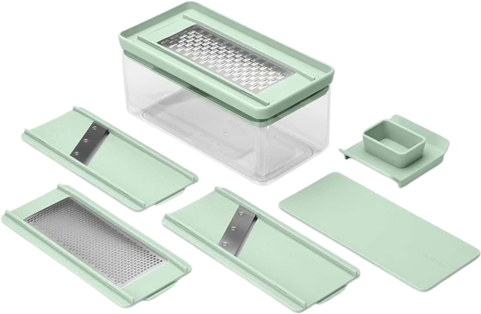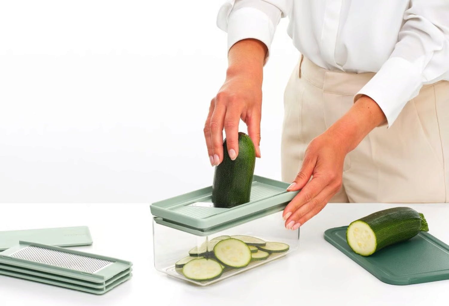 Ezzel a szeletelő- és reszelő készlettel az ételkészítés gyerekjáték lesz! Legyen szó finom sajtreszelésről, zöldségek durva aprításáról vagy precíz szeletelésről - ez a szett négy praktikus funkciót egyesít egy jól átgondolt kialakításban. A csúszásmentes talpnak, a praktikus gyűjtőtartálynak és az okos kézvédőnek köszönhetően biztonságosan, tisztán és hatékonyan dolgozhat. És ami a legjobb: használat után minden rendezetten tárolható a tartályban. Egyszerűen praktikus, nem igaz?