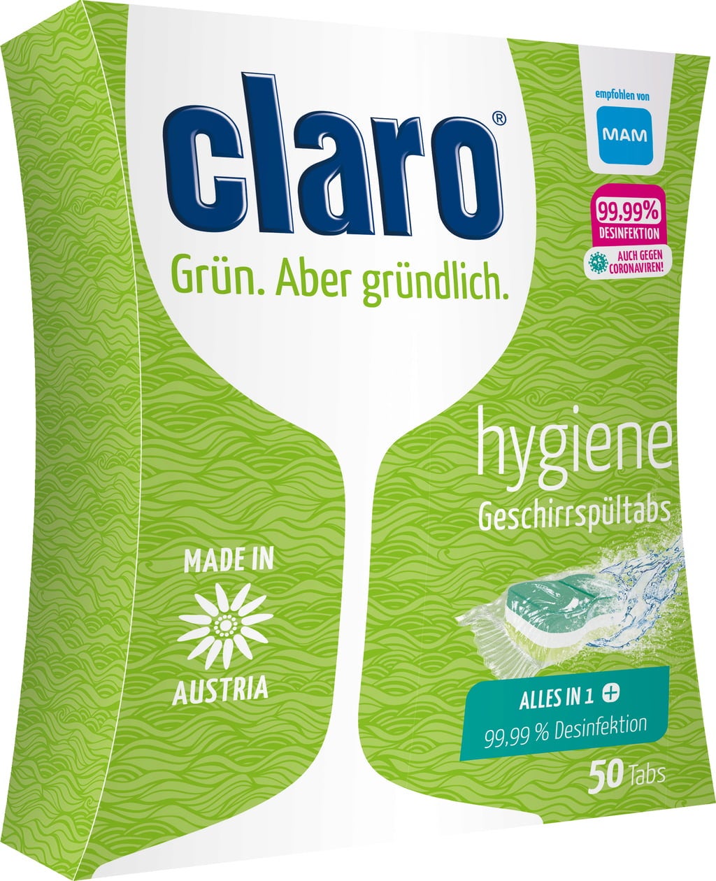 A claro hygiene tablettái különösen alkalmasak allergiában szenvedők számára, ugyanis az összes baktérium, vírus és gomba 99,99%-át eltávolítják. A babák evőeszközeit és cumisüvegeit is alaposan, valamint higiénikusan megtisztítják a maradványoktól, a tabletták azonban természetesen hagyományos edények elmosásához is használhatók. Mivel tartalmaznak mosogatógép só- és öblítőpótlékot, nincs szükség további termékek használatára. A tabletták alacsony hőmérsékleten is kifejtik teljes hatékonyságukat, és vízkőtlenítő funkciójukkal nyűgöznek le.