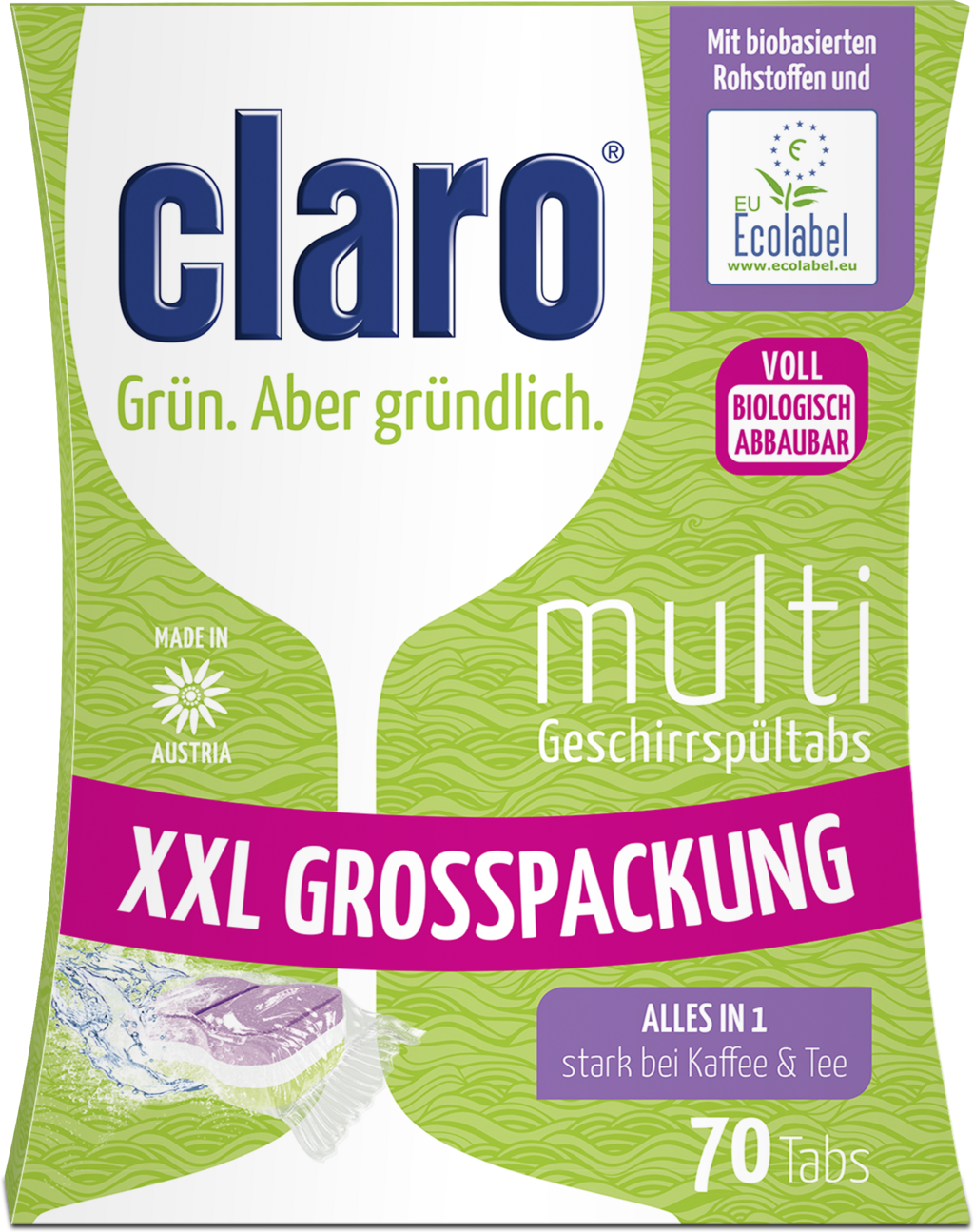 A claro multi tablettái egyszerre több funkciót is ellátnak, így nincs szükség további termékekre! Mosogatógép só és öblítő funkcióval rendelkeznek és rendkívül hatékonyak minden szennyeződéssel szemben. Magas fehérítőtartalmuknak köszönhetően sikeresen távolítják el a megszáradt kávé- és teafoltokat is. Ezenkívül aktív oxigént és vízkőtlenítő funkciót is tartalmaznak, valamint hozzájárulnak a gépek higiéniájához.