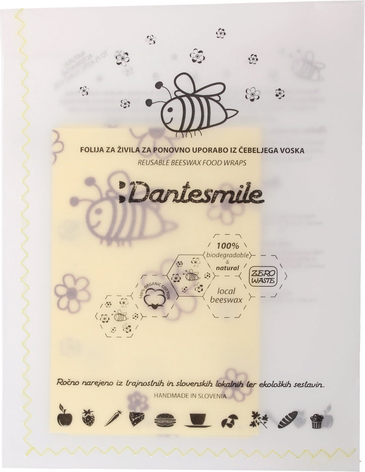 Ettől az aranyos designtól mindenki megéhezik! Ez a nagyszerű méhviasz kendő nemcsak vizuálisan megbabonázó, egyedülálló tulajdonságaival rendkívül meggyőző. 100% természetes bio pamutból készül, amelyet egy minősített szlovén méhészet bio méhviasza borít. A helyi eredetű, kímékletesen válogatott fenyőgyanta biztosítja a kendő szükséges tapadását, azaz, hogy biztonságosan, lezárva ölelje át az ételeket és harapnivalókat, és megbízható módon frissen tartsa. Erről nem utolsósorba természetesen a méhviasz tartalmazott propolisza gondoskodik.