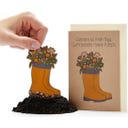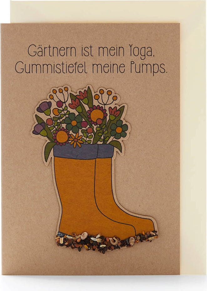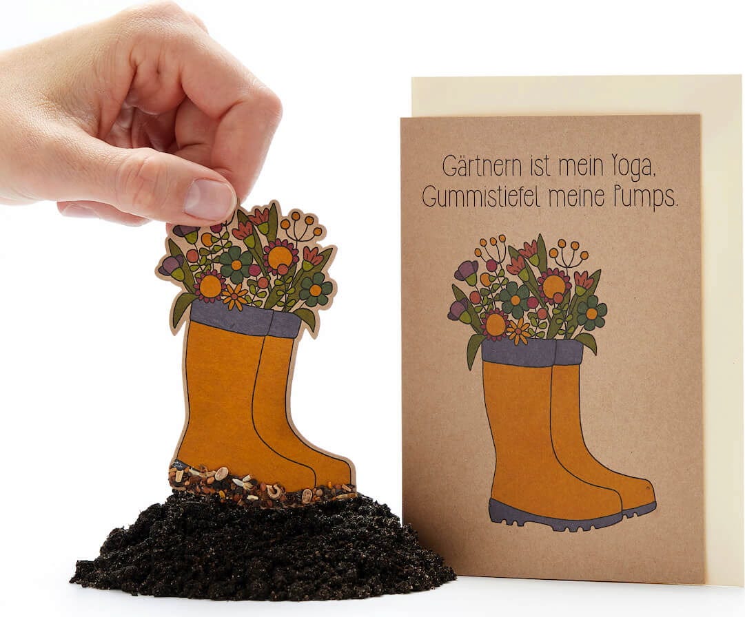 Ez a szeretettel készült üdvözlőlap tökéletes ajándék mindazoknak, akik az idejüket legszívesebben a kertben töltik. Ha Ön is ismer szenvedélyes "gumicsizmaviselőt" és hobbikertészt, megajándékozhatja ezzel a kártyával. Különösen nagyszerű: A gumicsizma levehető és földbe ültethető - hamarosan pedig kinőnek belőle a legszebb vadvirágok.
