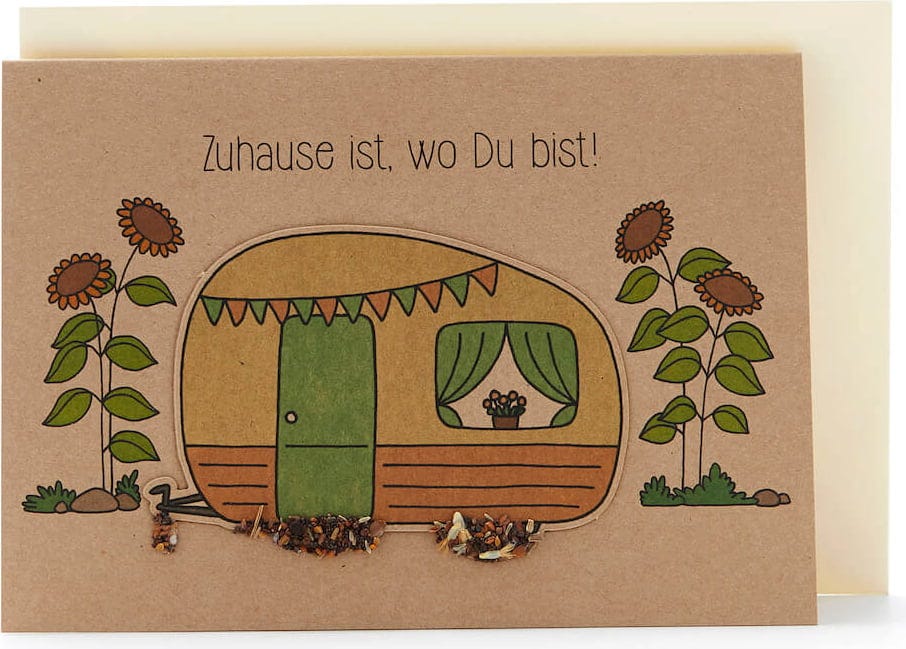 Az otthon nem helyfüggő, csak ott érzi magát otthon az ember, ahol a szíve van. Ez az elbűvölő üdvözlőlap így éppen annyira alkalmas a kanapéhuszároknak, mint a világjáróknak. Az üdvözlőlap mellett a vadvirágmagok is megörvendeztetik majd címzettjüket.