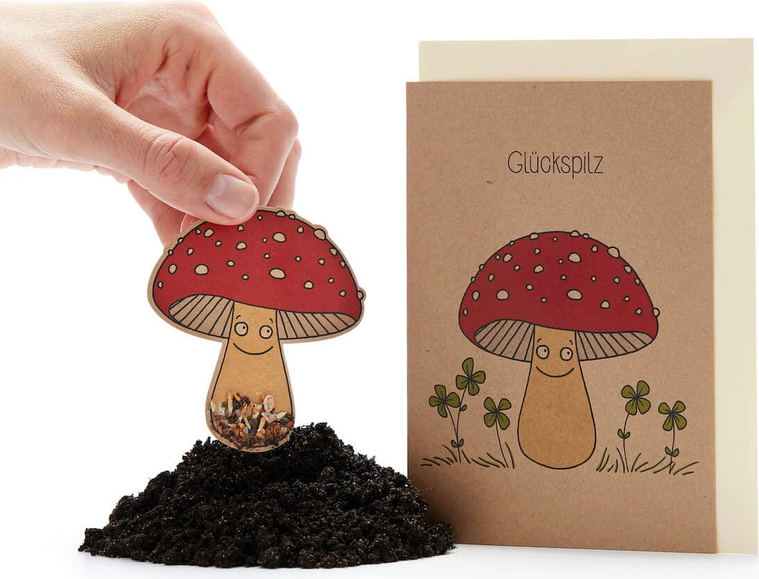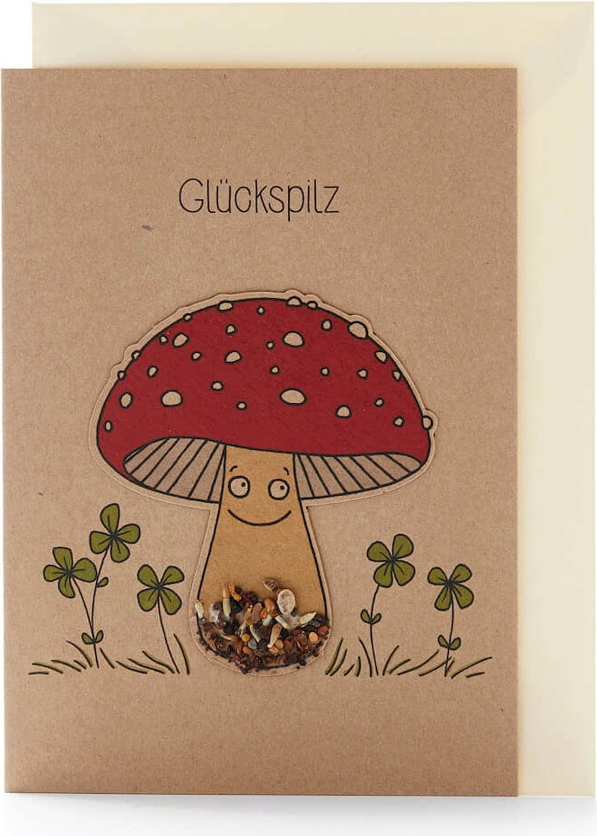 Két dolog van, amivel soha nem lehet betelni: a szerencse és a virágok! Milyen praktikus, hogy ez a szép üdvözlőlap mindkettőt tartalmazza – a szerencsegombát, mint személyes szerencsebűbájt, és az illatos vadvirágok magjait.