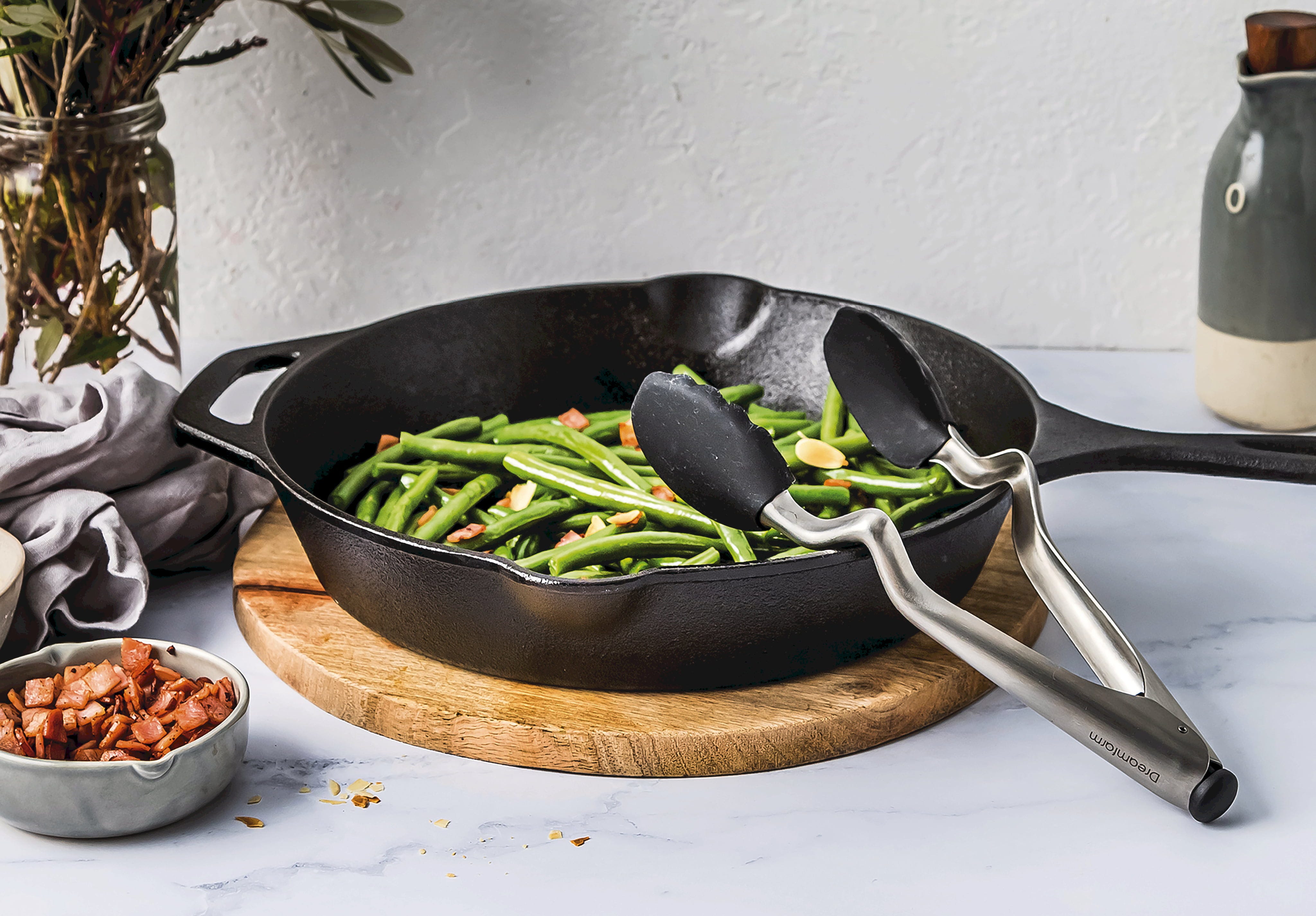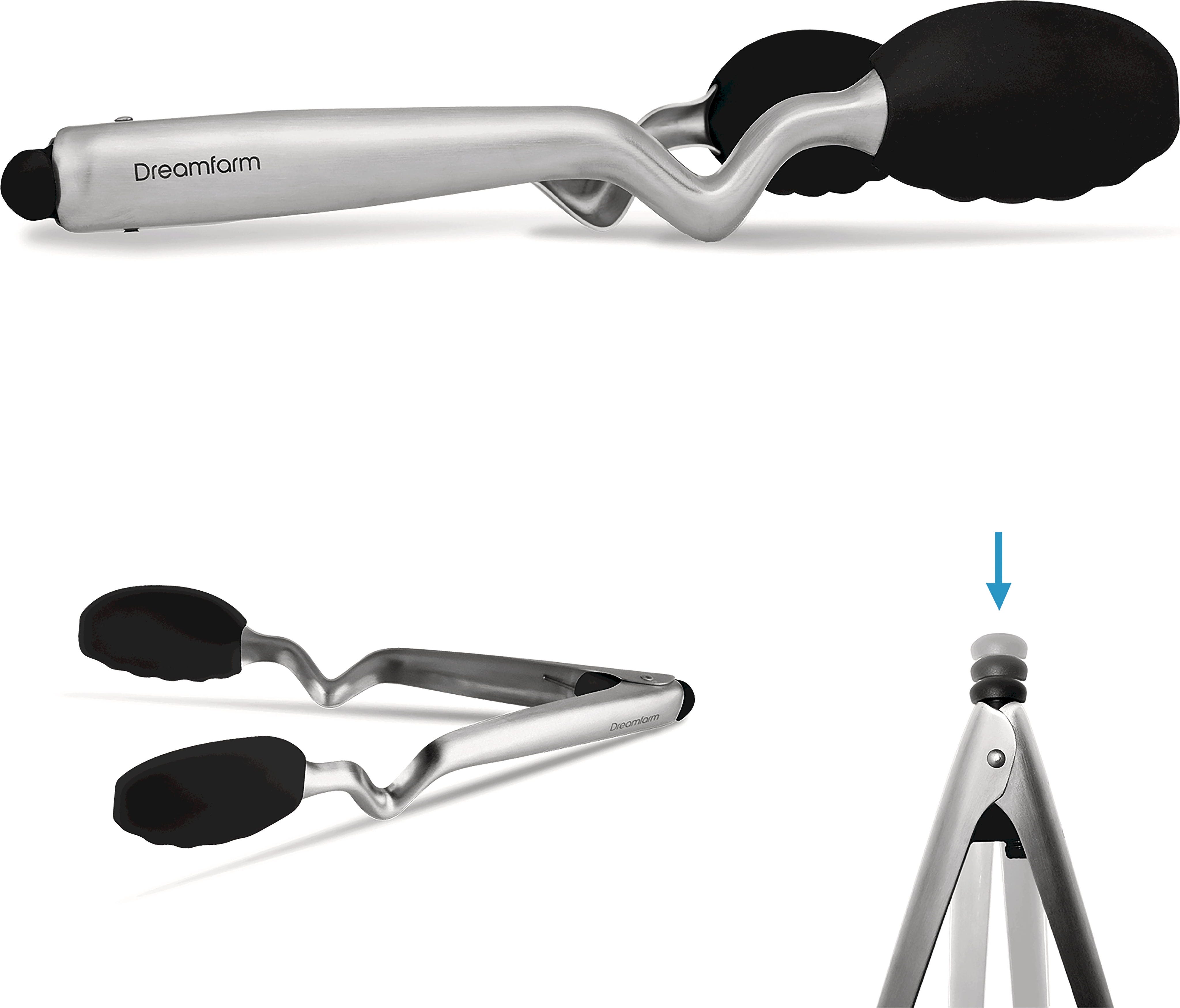 A Dreamfarm Clongs konyhai csipesz az ultimatív megoldás a főzéshez és tálaláshoz. A nyélben található egyedülálló törésnek köszönhetően a fejek soha nem érintkeznek a munkafelülettel, amikor Ön lerakja azokat. A nyél végén található okos gombmechanizmussal a fogó kényelmesen, egy gombnyomással nyitható és biztonságosan rögzíthető.