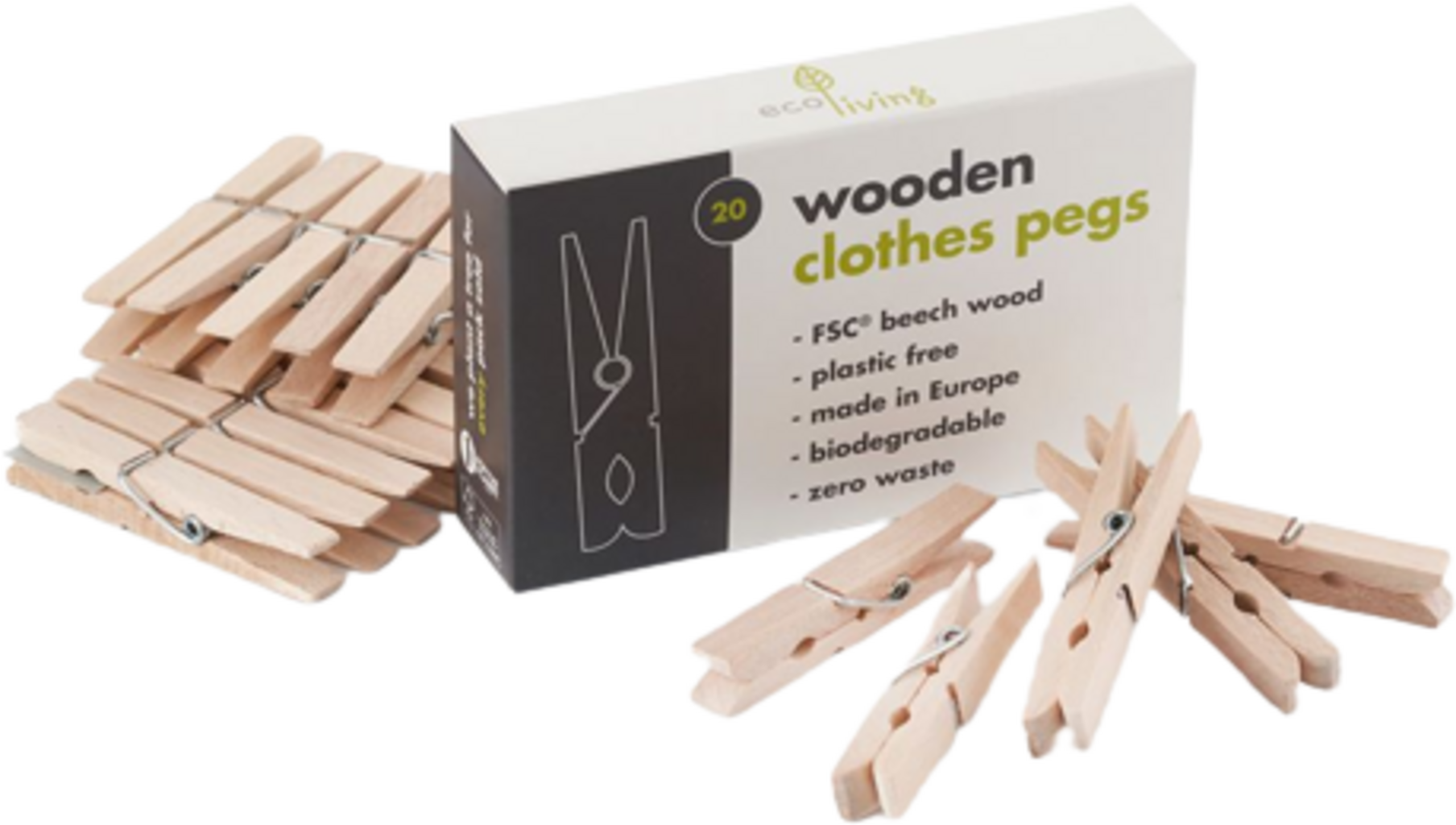 Ezek a ruhacsipeszek bükkfából állnak, és fémrugóval rendelkeznek, így környezetbarát alternatívát jelentenek, mivel a fa komposztálható, a fémrugó pedig újrahasznosítható. A csomagolás is teljesen műanyagmentes, a csipeszek újrahasznosított kartondobozban érkeznek meg Önhöz.