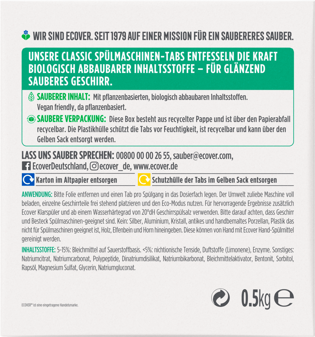 A cellulóz-tenzidek Alacsony-Energiájú-Módszerrel megújuló nyersanyagokból, valamint mezőgazdasági hulladékokból, mint a szalma és a búzakorpa, az Ecover környezetbarát gyárában előállítottak. A mosogatógép tabletták foszfát mentesek, így rendkíbvül kíméletesek a vízhez (szennyvíz). Az összetevők növényi és ásványi alapúak, így vegánoknak is alkalmas a termék.