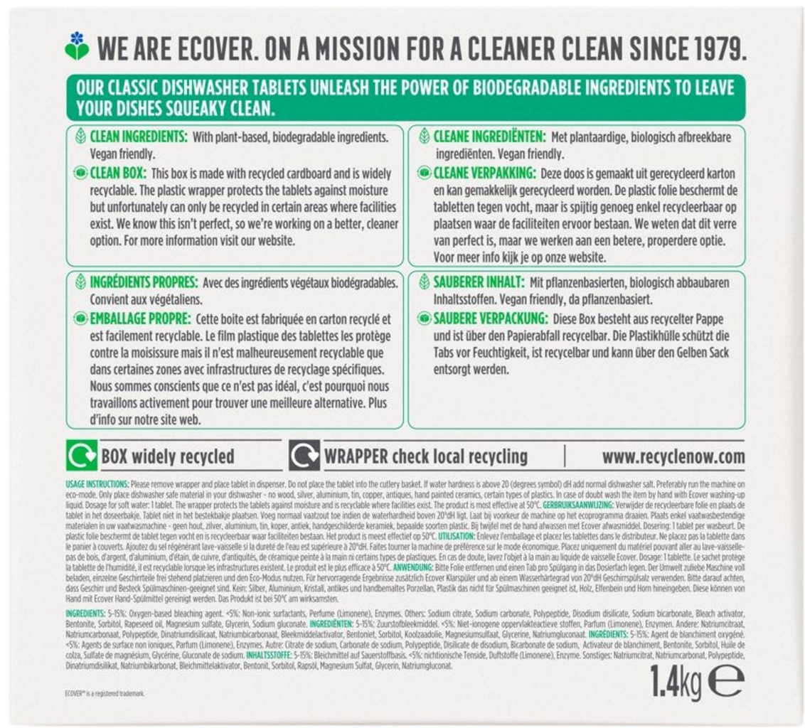 A cellulóz-tenzidek Alacsony-Energiájú-Módszerrel megújuló nyersanyagokból, valamint mezőgazdasági hulladékokból, mint a szalma és a búzakorpa, az Ecover környezetbarát gyárában előállítottak. A mosogatógép tabletták foszfát mentesek, így rendkíbvül kíméletesek a vízhez (szennyvíz). Az összetevők növényi és ásványi alapúak, így vegánoknak is alkalmas a termék.