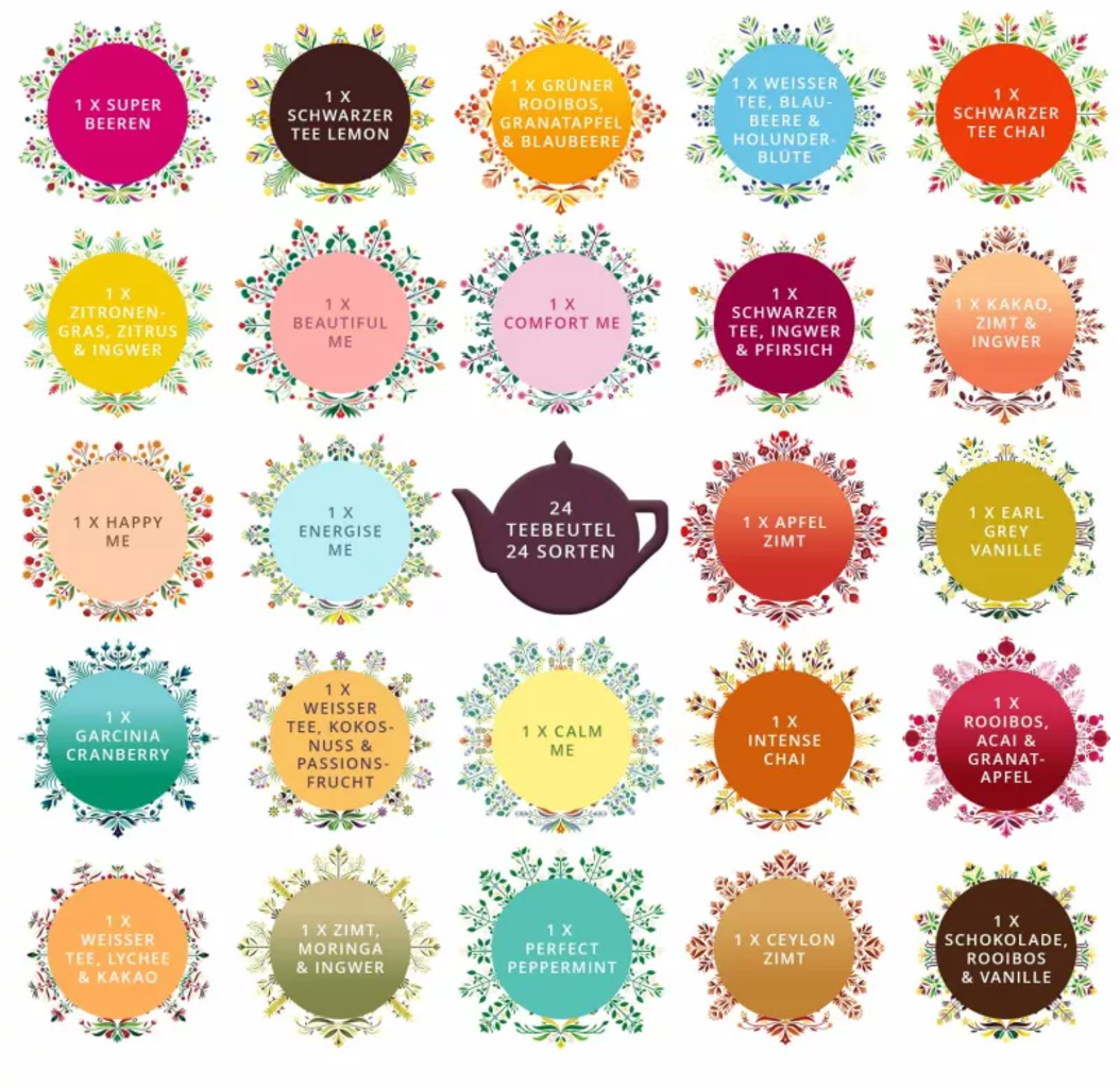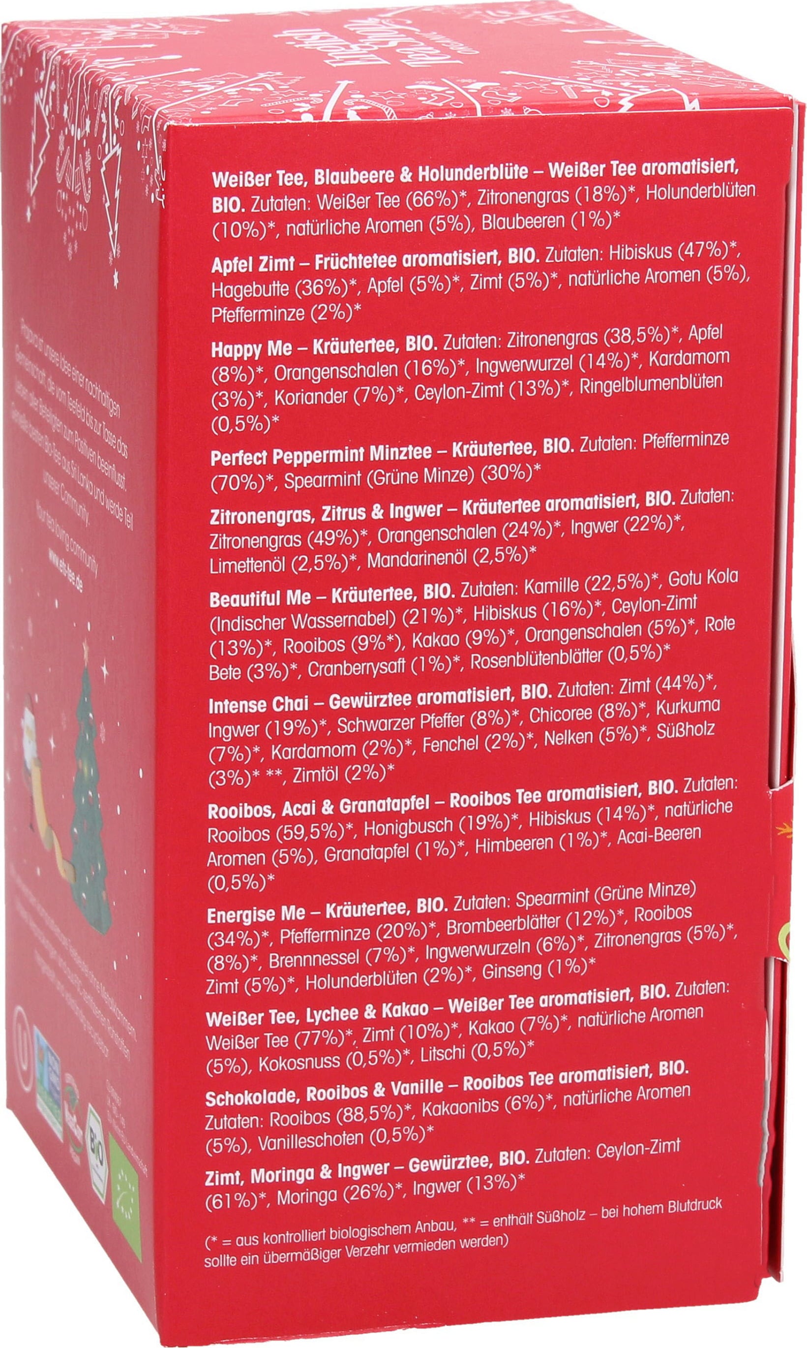 Teázzon és várja a Jézuskát – a 24 trendi bio teakeverék megkönnyíti a kikapcsolódást! Még akkor is, ha javában zajlanak a karácsonyi előkészületek: az ínyencek időről időre beutazzák a világ legszebb tea-, gyógynövény- és gyümölcsöskertjeit, hagyják magukat aromás illatokkal kényeztetni, és várják a szemlélődő pillanatokat - legyen az angyal, csibész vagy grincs.