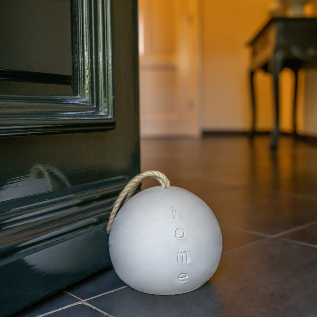 Ez az Esschert Design beton megjelenésű ajtótámasz a home feliratot viseli, bel- és kültéren egyaránt használható. A juta hurok megkönnyíti az ajtótámasz felemelését és elhelyezését. A golyó alján hab matricák találhatók, hogy megakadályozzák a padló karcolódását.