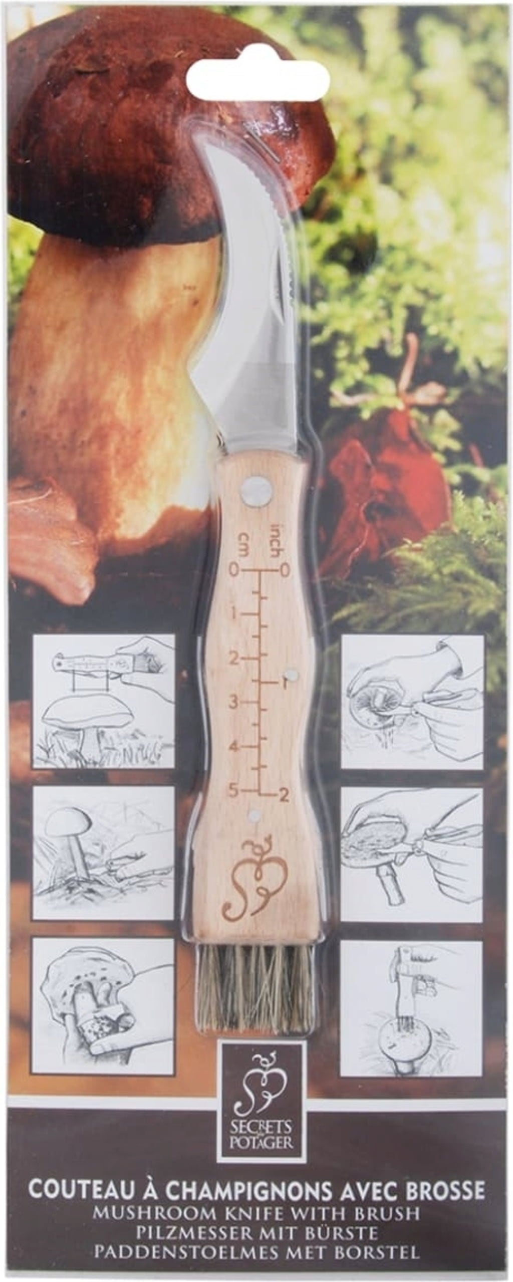 • A bükkfa nyélen található mérőskálával (cm és hüvelyk) pedig könnyedén meghatározható a felszedett gomba mérete.
