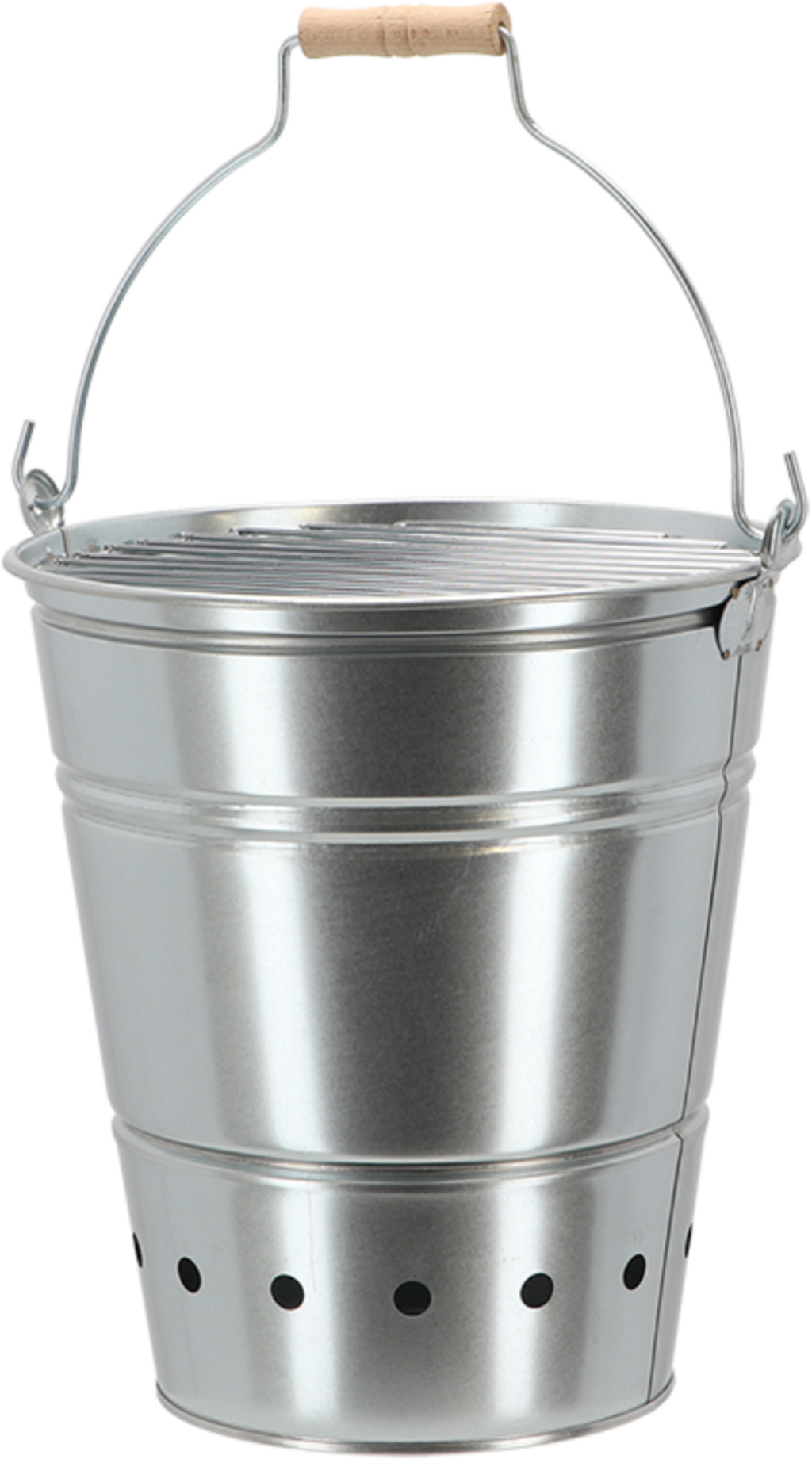 Grillsütő vödör grillrácstal és fa fogantyúval cink anyagból. Kényelmesen hordozható, akár egy szabadtéri piknik során.