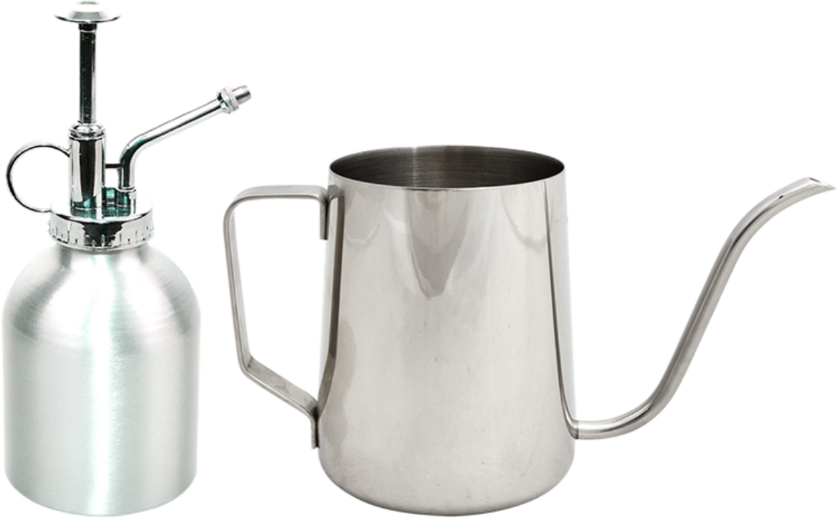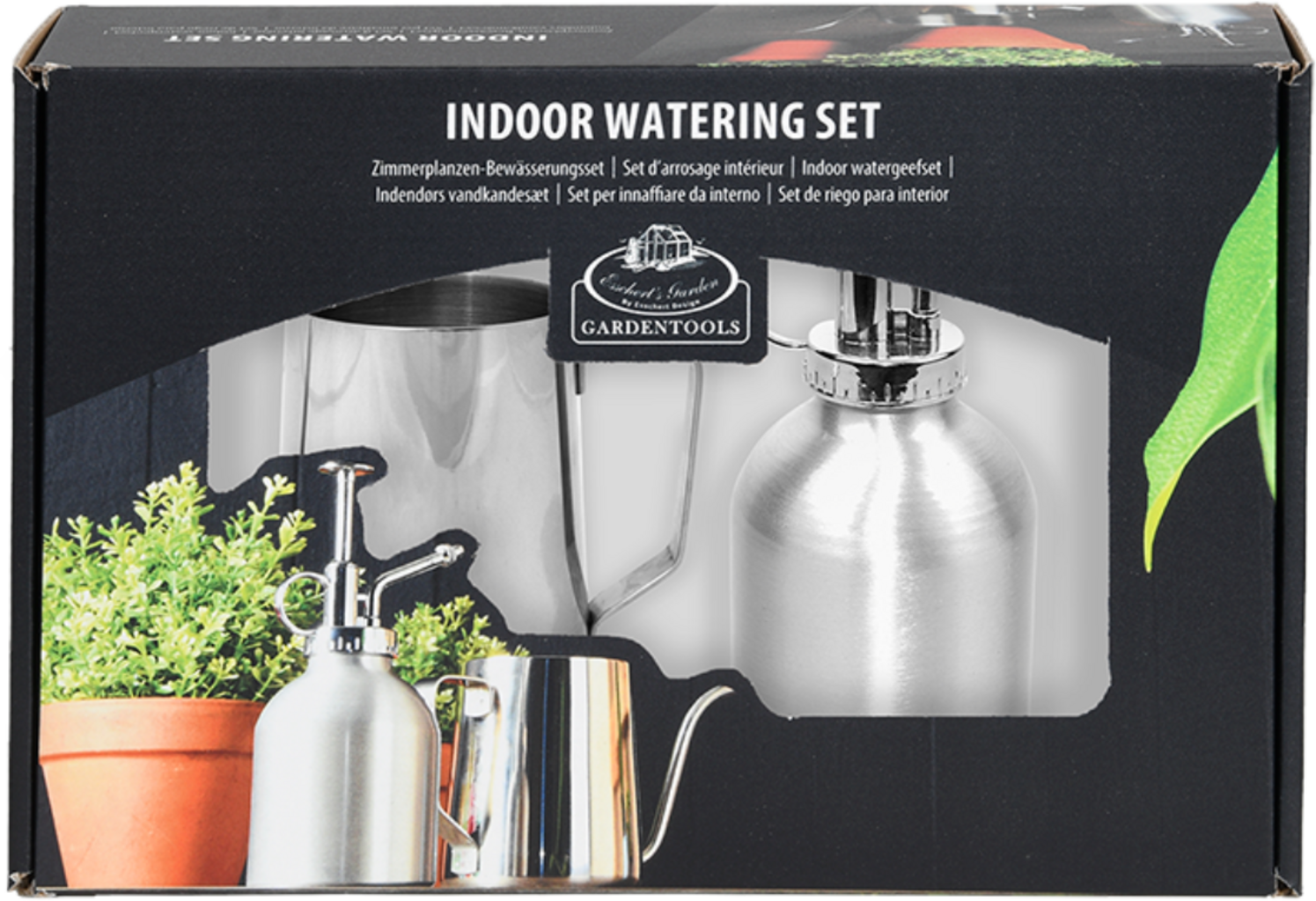 A stílusos készlet egy növénypermetezőből és egy rozsdamentes acél öntözőkannából áll. Különösen okos: a növénypermetező egy kézzel is kezelhető, így az egyik kéz mindig szabadon marad a kertészkedéshez. Az öntözőkanna keskeny kifolyócsővel rendelkezik a célzott öntözésért.