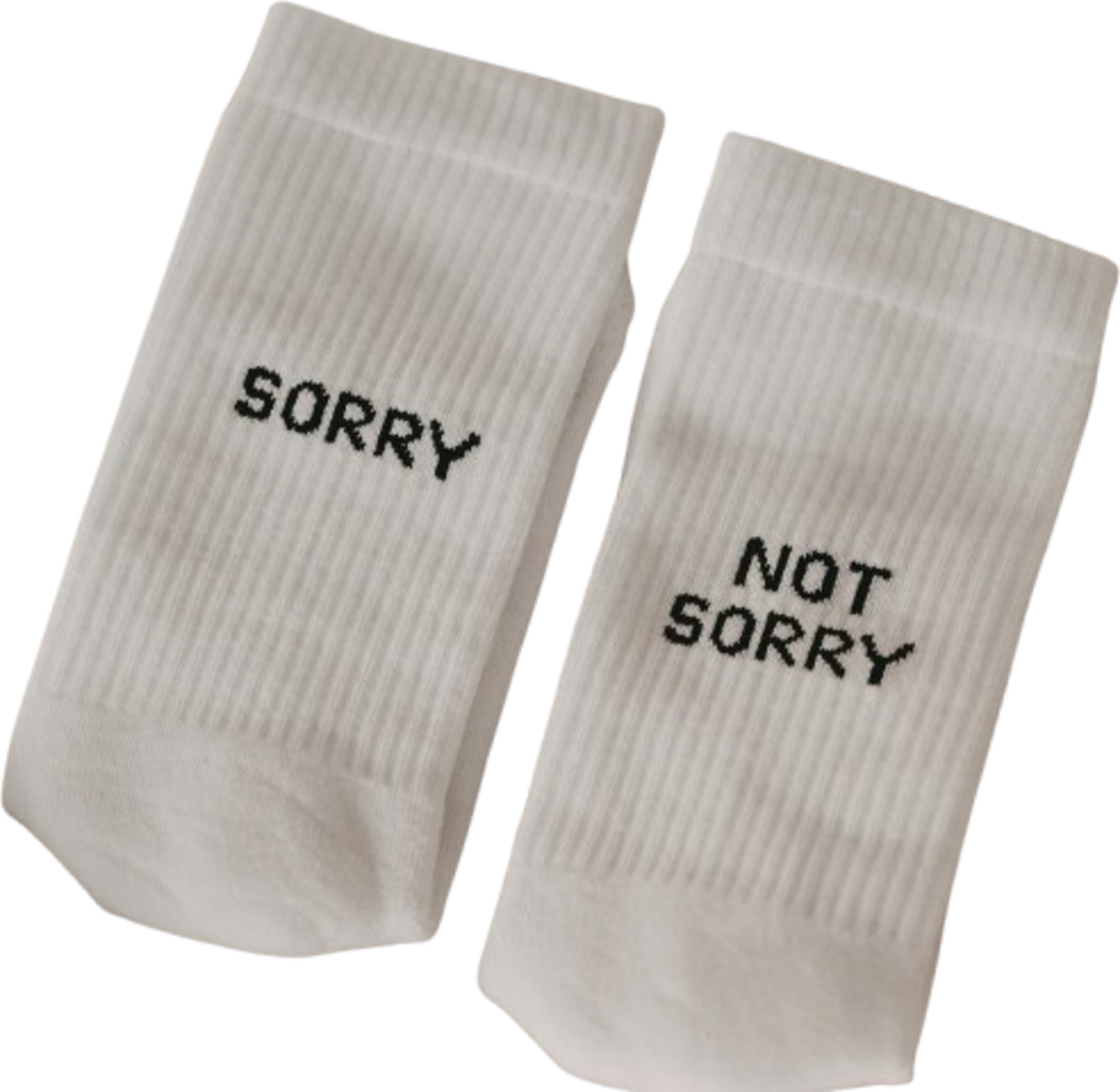 Azoknak, akik tudják, mit akarnak: Ezek a fehér zoknik a fekete "Sorry not Sorry" felirattal a sarkukon nemcsak kényelmet, hanem magatartást is visznek a mindennapokba. A puha bio pamut, a megerősített zónák és a rugalmas szárvég átfogóan kellemes viselési kényelmet biztosítanak - kikacsintással és stílussal.