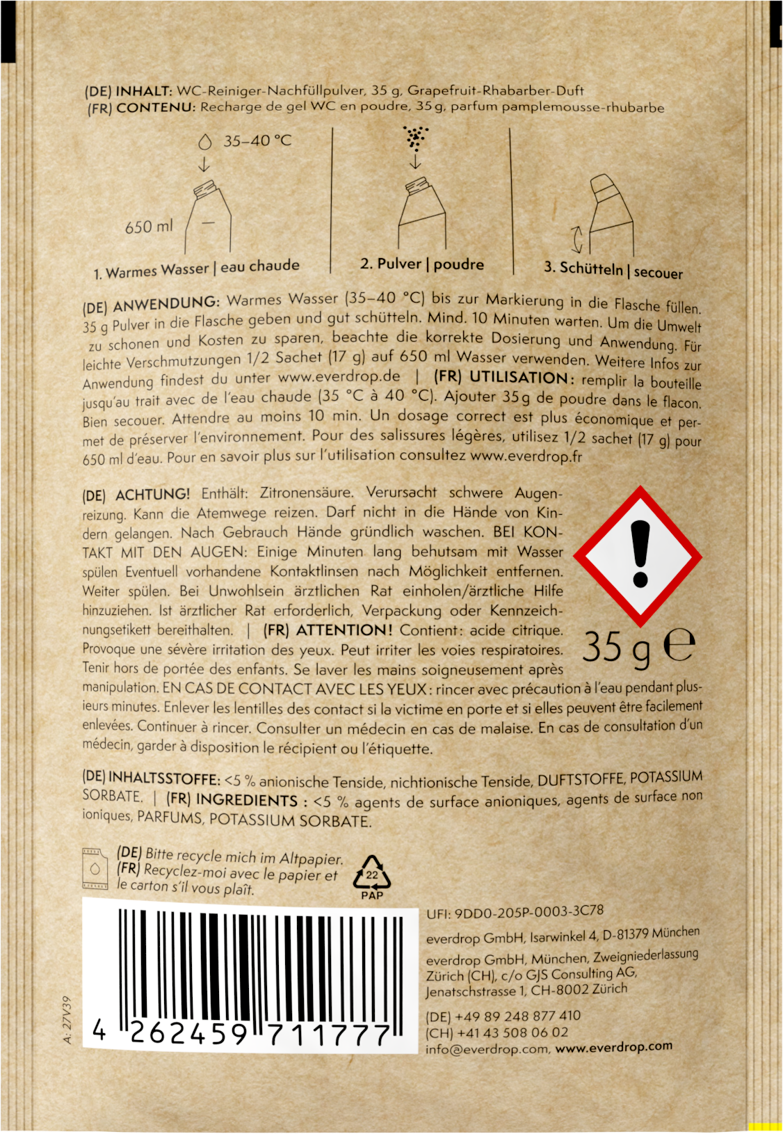 Vízzel elkeverve ez a por hatékony WC-tisztítóvá alakul, amely újszerűen ragyogóvá varázsolja a WC-jét!