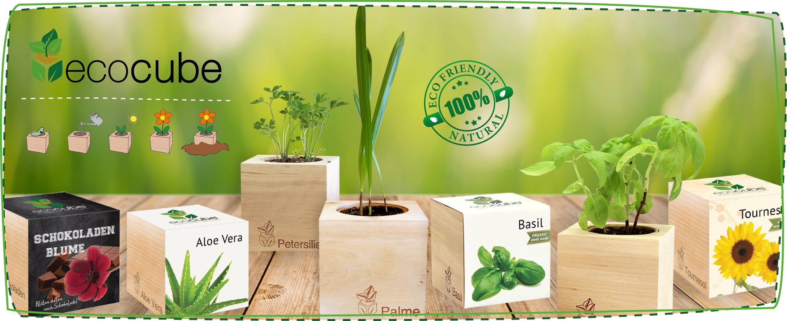 A dekoratív fakockából a magok rövid idő után virágokká és gyógynövényekké válnak. A kockák kiváló minőségű égerfából készülnek, speciális tápanyaggranulátummal és magokkal töltik meg őket, majd csíravédett matricával zárják le.