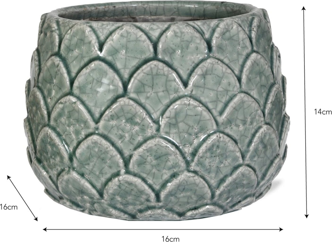 Ez a kiváló minőségű kerámiából készült virágcserép rendkívüli megjelenésével egészen különleges dísze a polcoknak, asztaloknak és ablakpárkányoknak. Az articsóka formájú dizájn egyszerre stílusos és eredeti, és ellenállhatatlanul vonzóvá varázsolja ezt a csinos edényt.