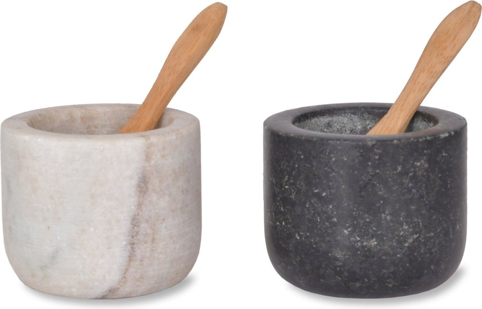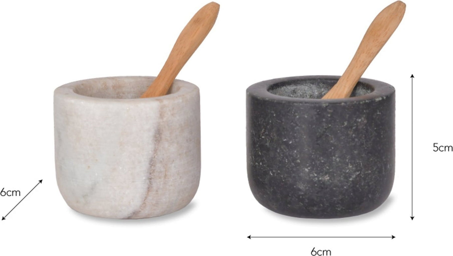 Ez a duó különösen szép módja a só és bors tálalásának. A márvány és gránit kombinációja egyedi megjelenést kölcsönöz, és minden asztal kihagyhatatlan elemévé varázsolja. A kis bambusz kanalak megfelelően kiegészítik, és tökéletesek a megfelelő mennyiségű fűszer kikanalazásához.