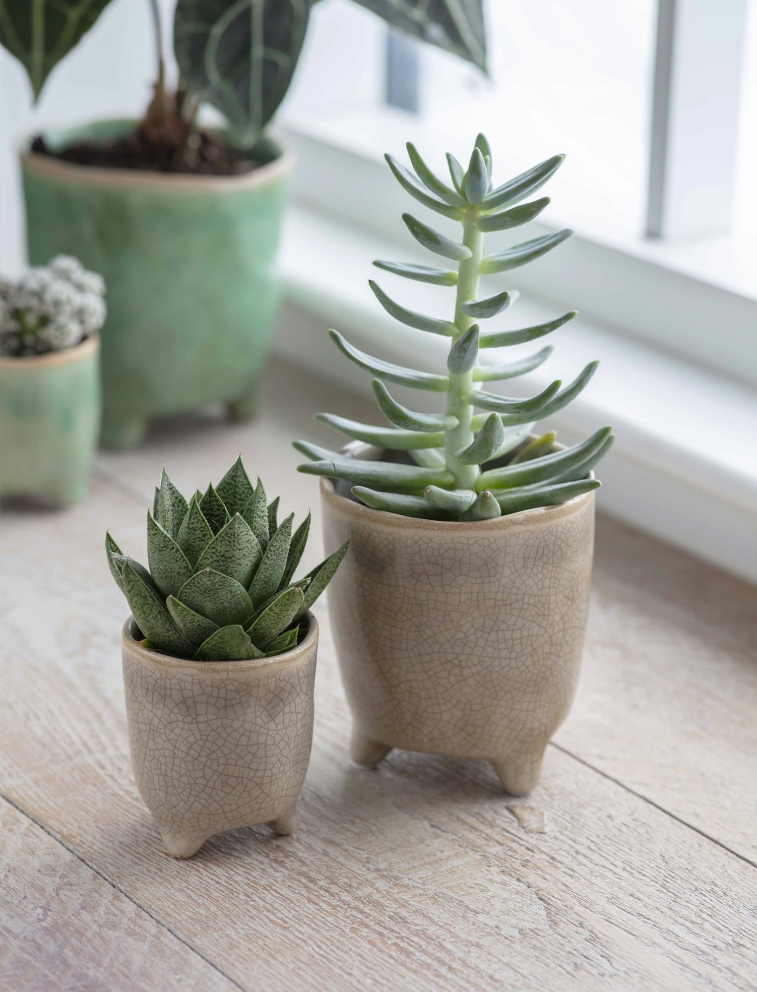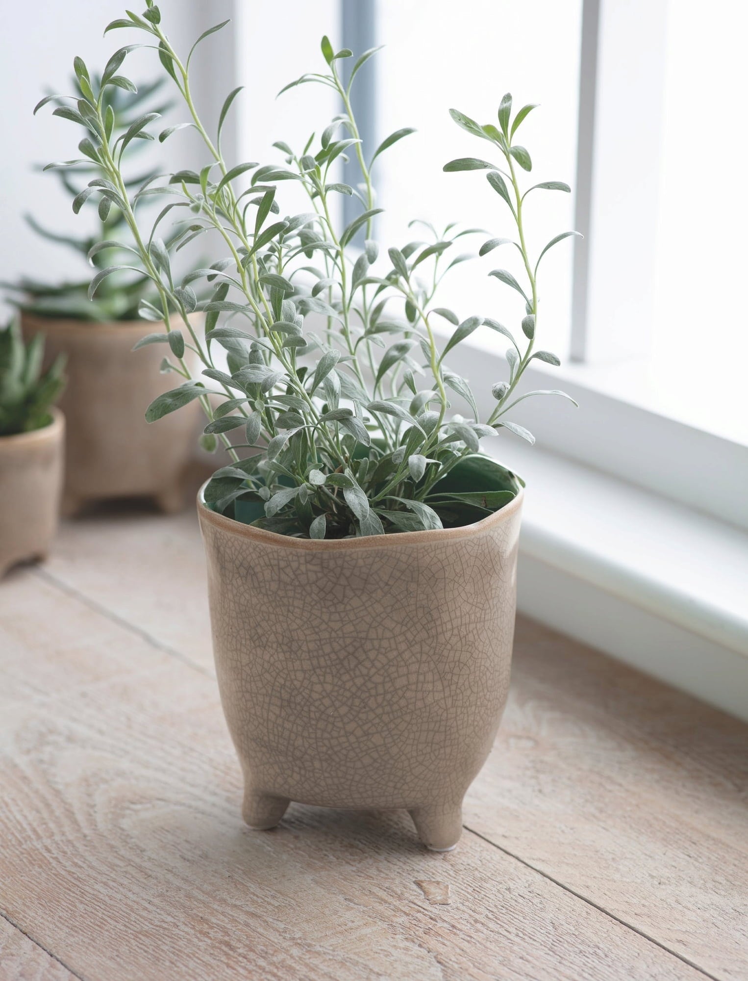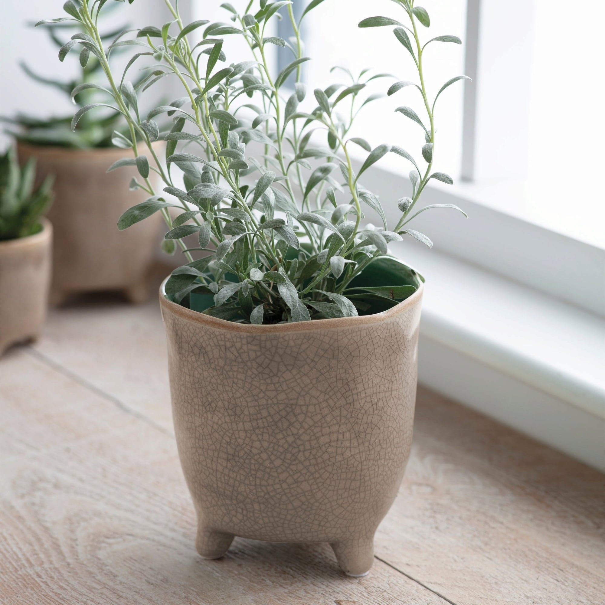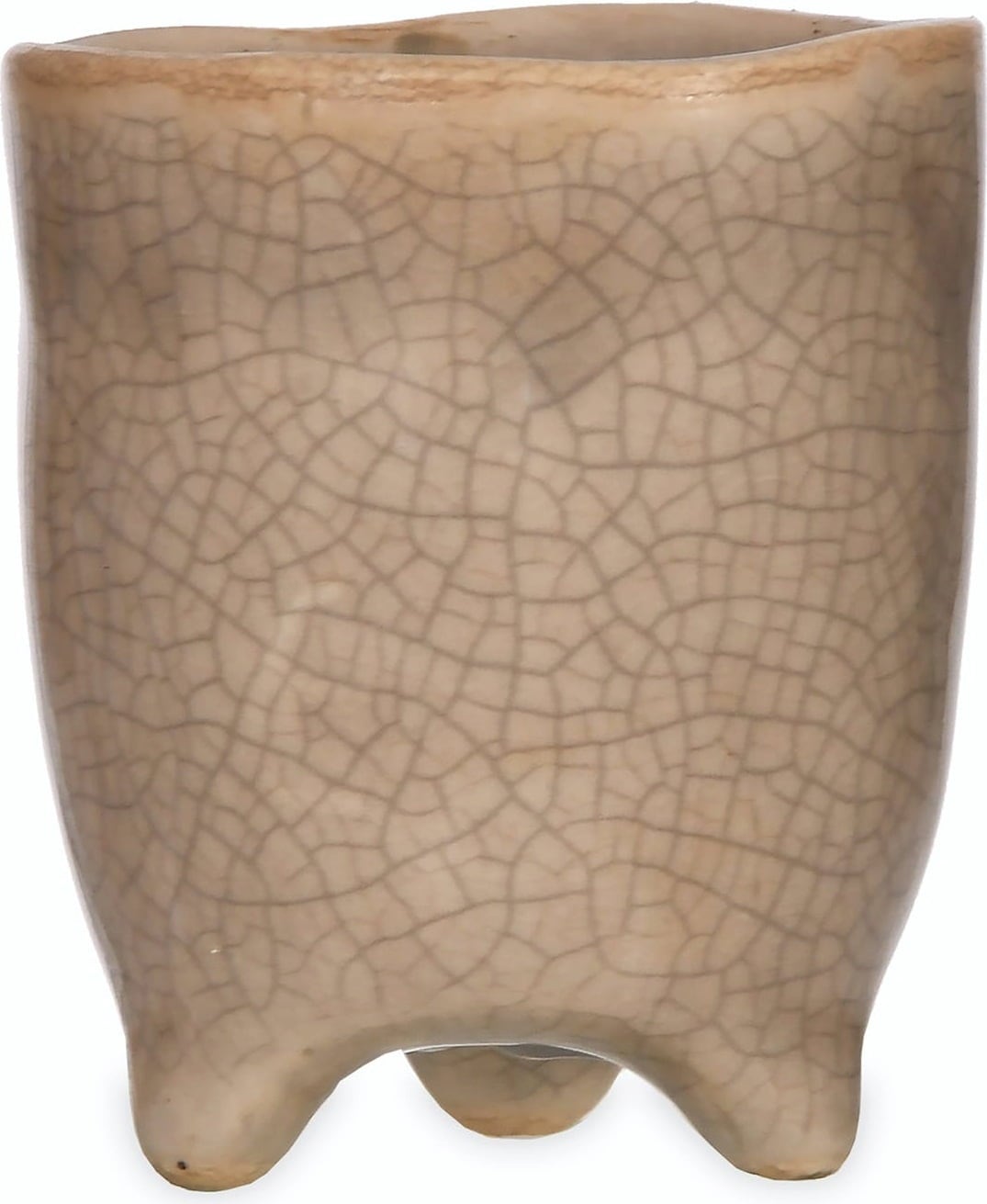 Ez a csodálatos virágcserép igazi látványelem. Kerámiából, rusztikus repedezett mázzal készült, lágy kőszínben. Lábain gumibetétek találhatóak a biztonságos elhelyezkedés és a felületek karcolódásának elkerülése érdekében.