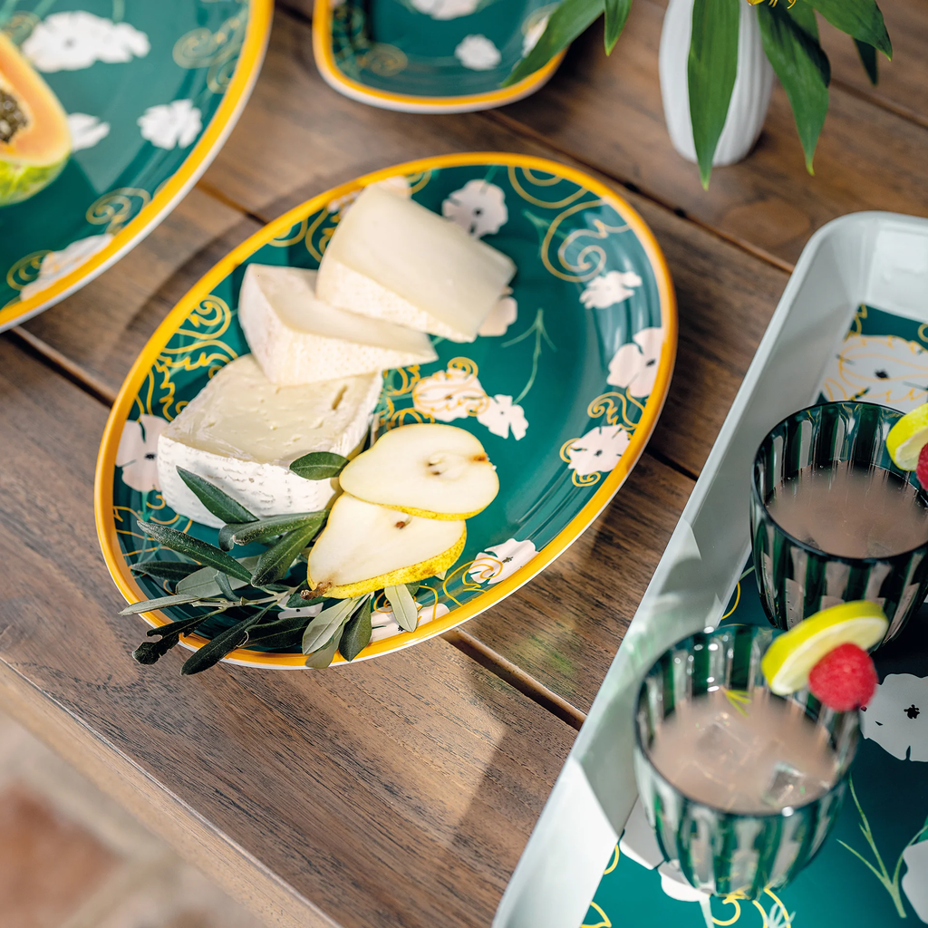 Ha egy csipetnyi eleganciával szeretné lenyűgözni vendégeit, akkor a guzzini "Fusion" tálalótál pont az, amire szüksége van. Élénk zöld árnyalatok, fehér virágokkal és arany díszítésekkel kombinálva bármilyen asztalt ünnepi hangulattá varázsolnak!