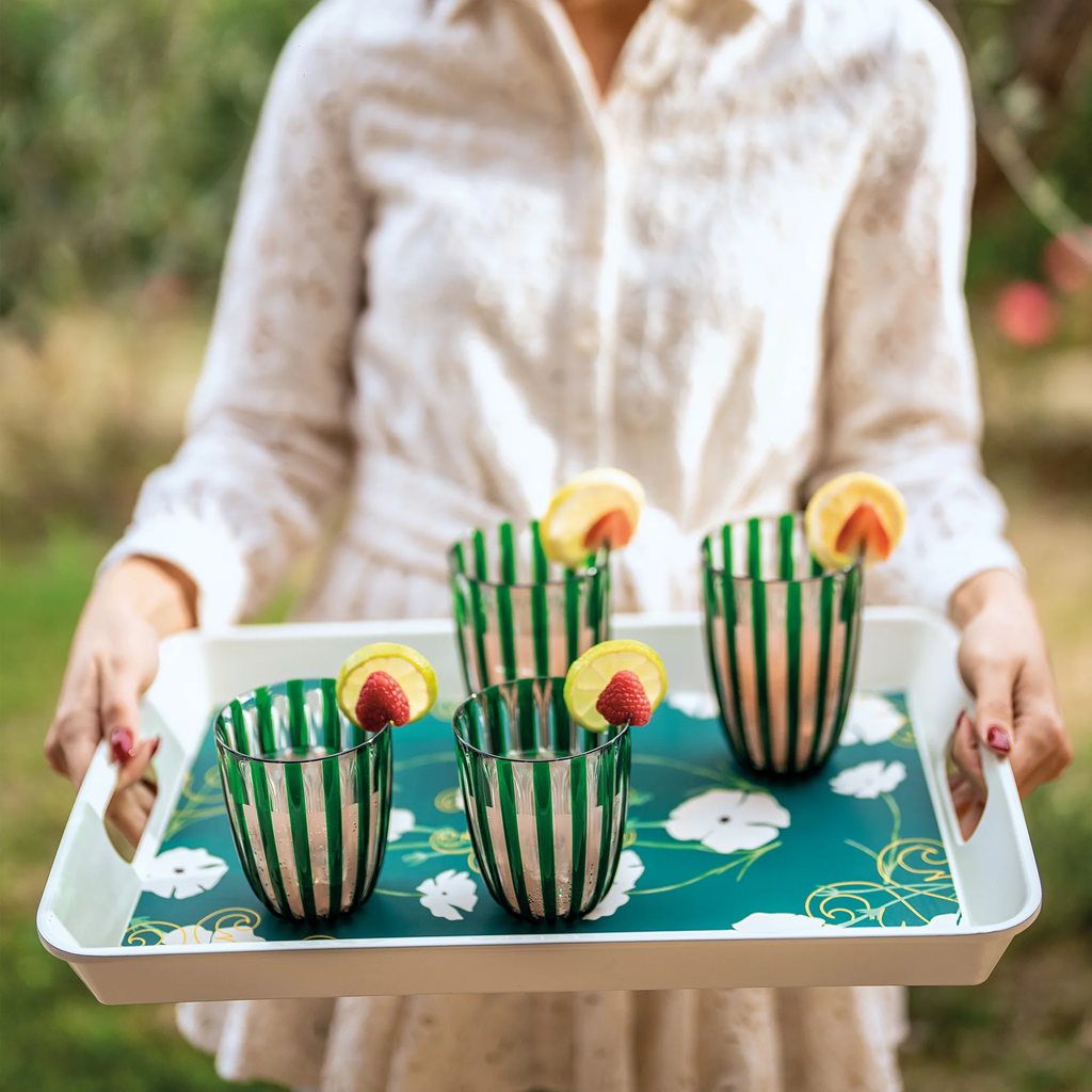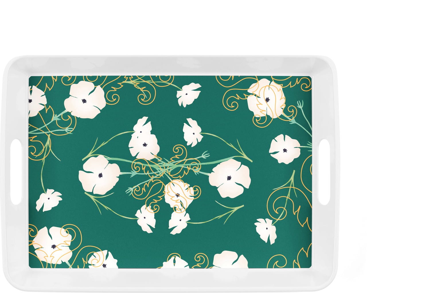 A guzzini téglalap alakú "Fusion" tálca igazi fénypont lehet bármelyik étkezőasztalra! Mélyzöld színével, fehér virágokkal és arany díszítéssel stílusosan szemet gyönyörködtető darab.