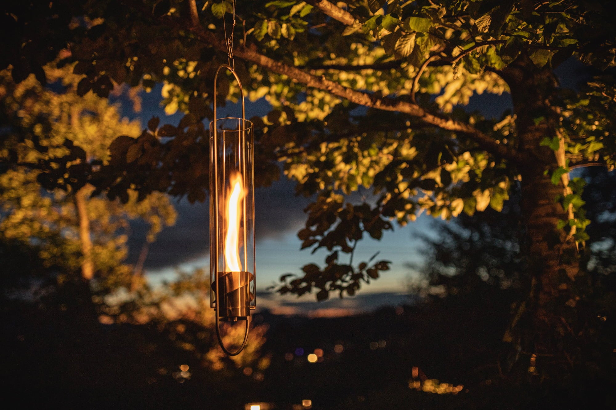 Ilyen egyszerű: töltse meg az utántöltőt fenntartható bioetanollal, rögzítse a függőtüzet a kívánt helyre, és gyújtsa meg a tüzet. Az üvegtartály elhelyezése után a tűz forogni kezd. Feltöltés után a láng körülbelül 80 percig ég, a korábban történő eloltáshoz használhatja a praktikus oltófedelet.