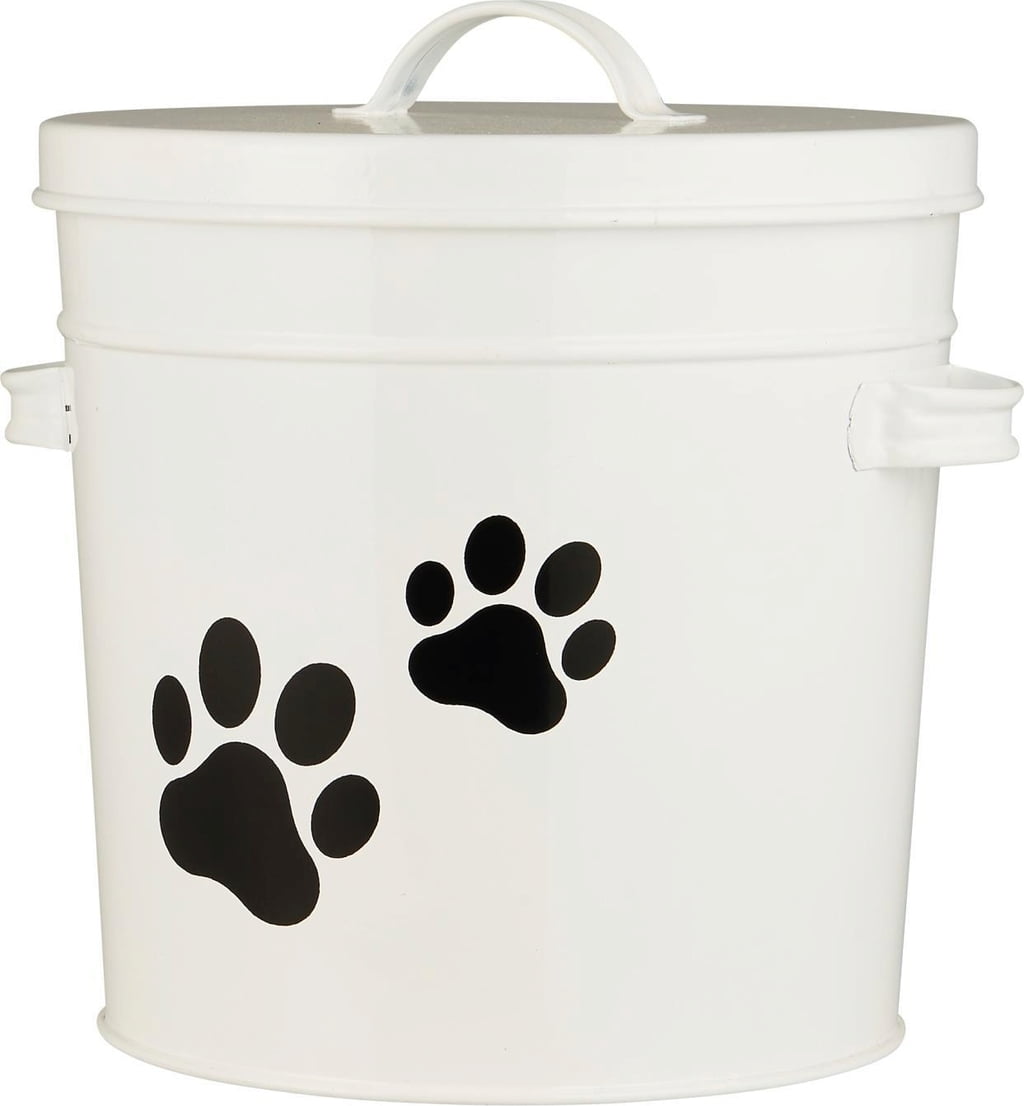 Masszív fém vödör aranyos mancs motívummal. Ideális megoldás száraz eledelek, finomságok vagy játékok tárolására.