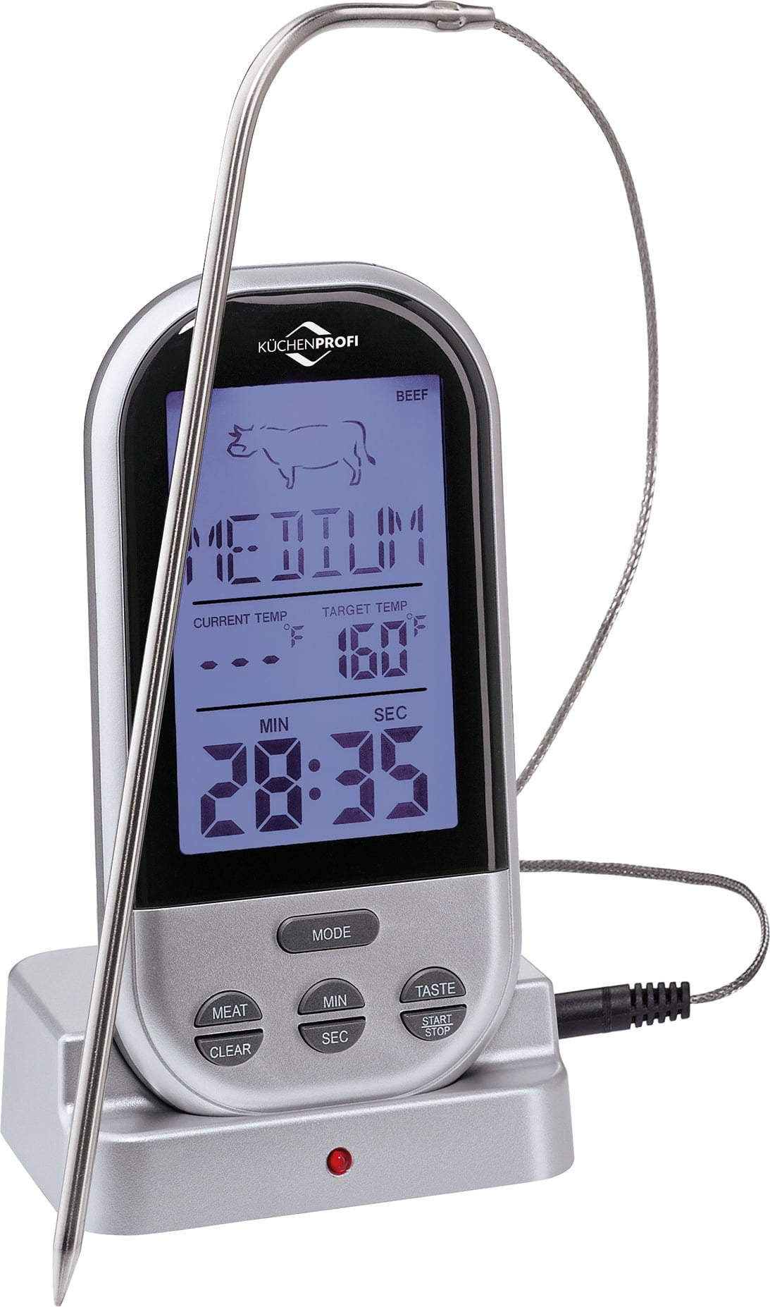 Egyszerű használat: Egyetlen gombnyomással válassza ki a hús típusát és a kívánt sütési fokot – ez manuálisan is beállítható. Ezután a fém mérőszonda hegyét félig helyezze be a sült legvastagabb részébe. Amint elérte a kívánt maghőmérsékletet, egy hangjelzés hallható, és a sült tálalásra kész.