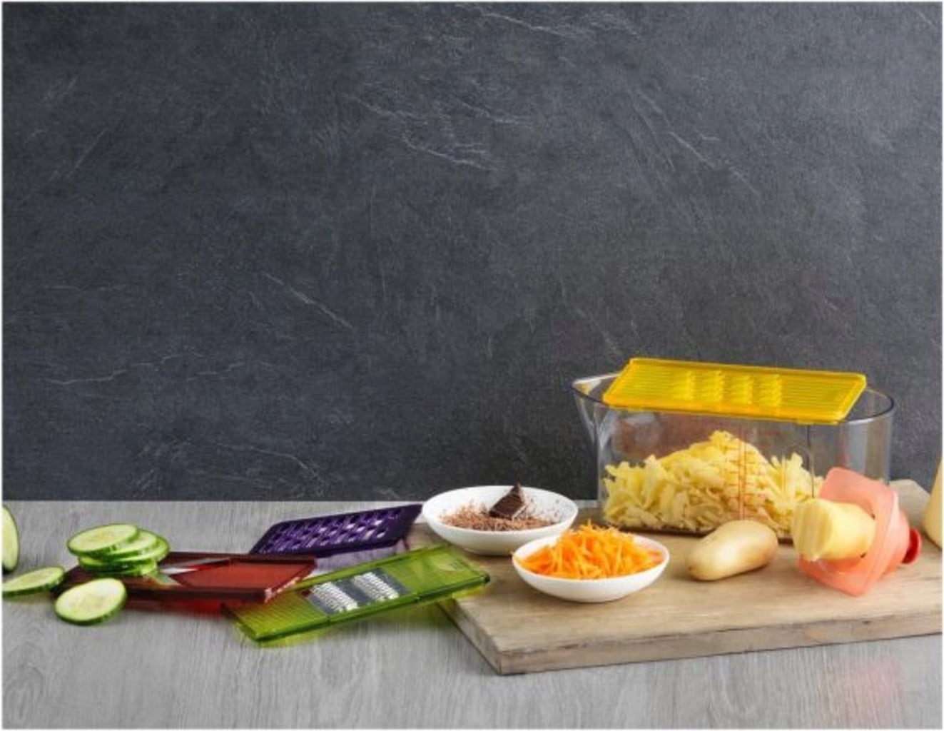 A tökéletes konyhai kisegítő ideális uborka, burgonya, julienne csíkok, sajt, fokhagyma, valamint citrusfélék szeleteléséhez és reszeléséhez.
