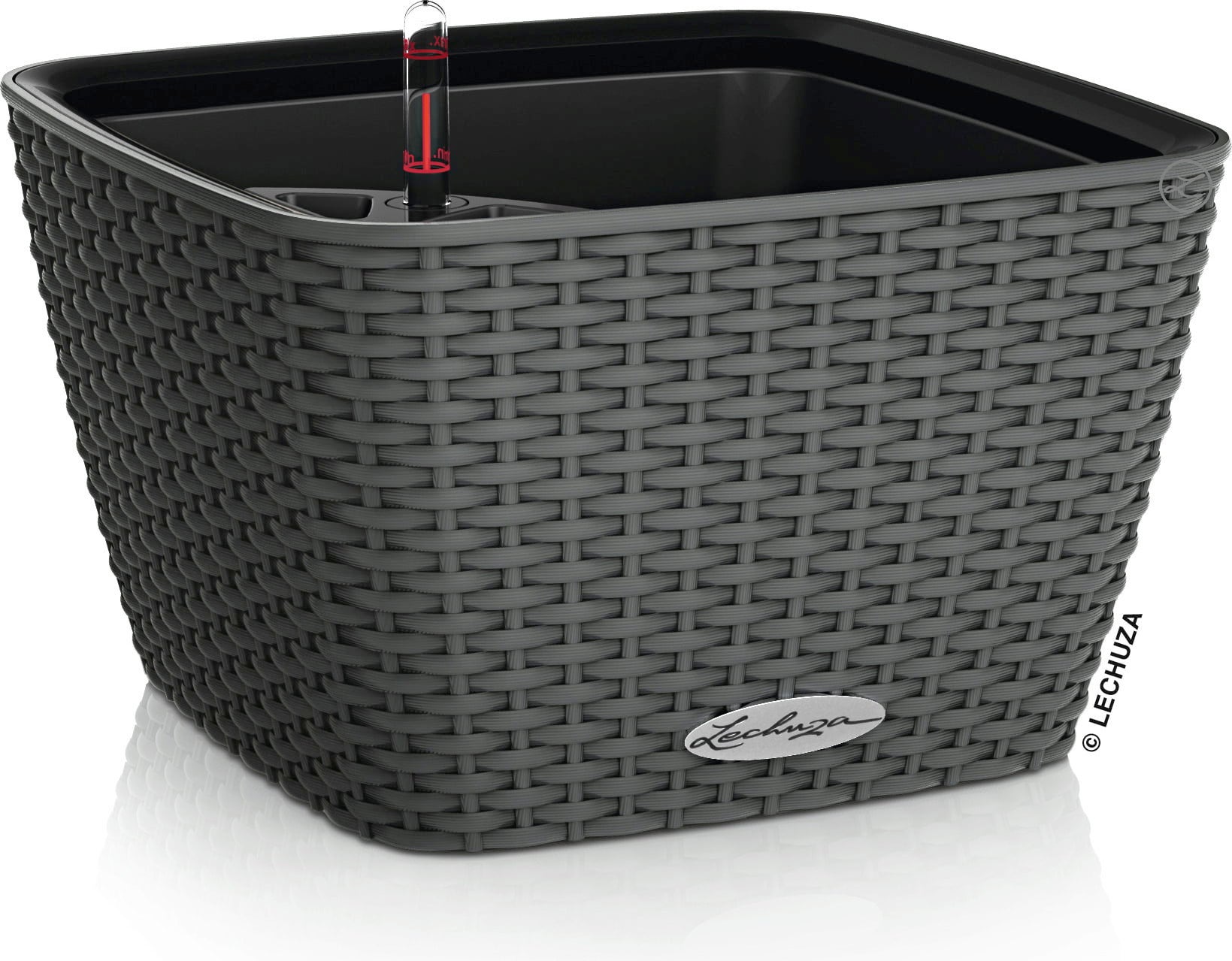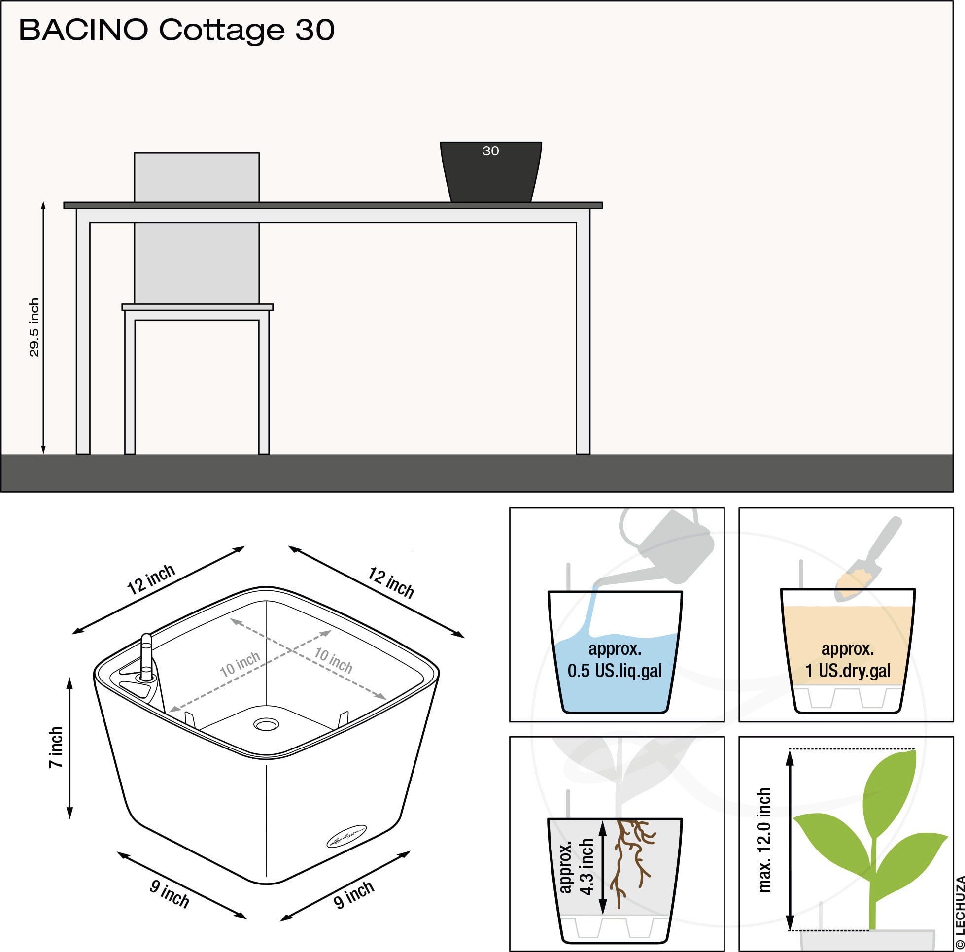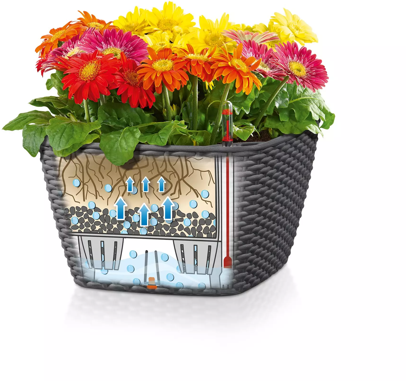 A Cottage kollekcióhoz tartozó BACINO virágtartó négyzet alakjával és 18 cm-es magasságával igazán sokféleképpen elhelyezhető az erkélyen és teraszon. Akár az asztalon, akár a padlón, vagy a lépcsőn: szépen beültetve jól érzi magát bárhol, és még beltéren is jól néz ki. A szabadalmaztatott Lechuza Öntözőrendszernek köszönhetően mindenkor garantált az optimális vízmennyiség.