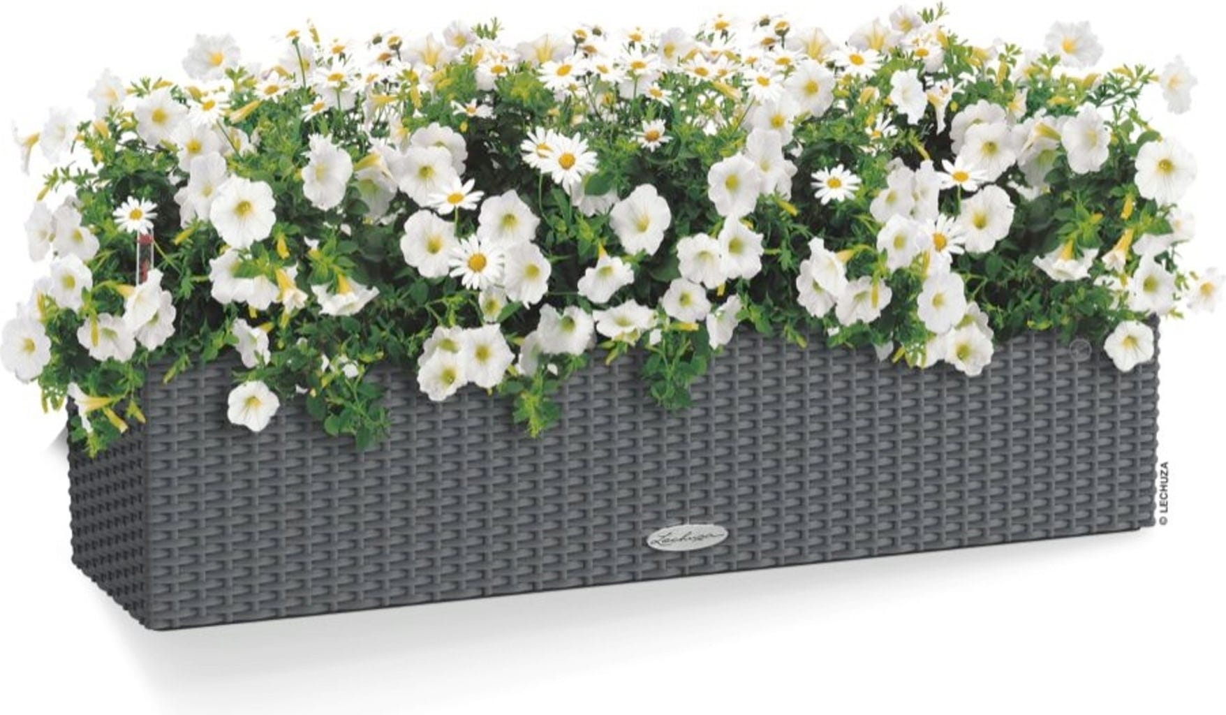 A romantikus vidéki ház stílus által ihletett "Balconera Cottage" virágtartó rengeteg helyet kínál a színes virágok számára. Az ötletes "All-in-One"-rendszer két kivehető betétjével és a Lechuza intelligens öntözőrendszerével a virágtartót egy abszolút kedvenccé teszi. Akár szabadon, akár az erkélykorláthoz rögzítve a külön megvásárolható tartókkal - az UV-álló polipropilénből készült növényláda egy stílusos kiegészítő.