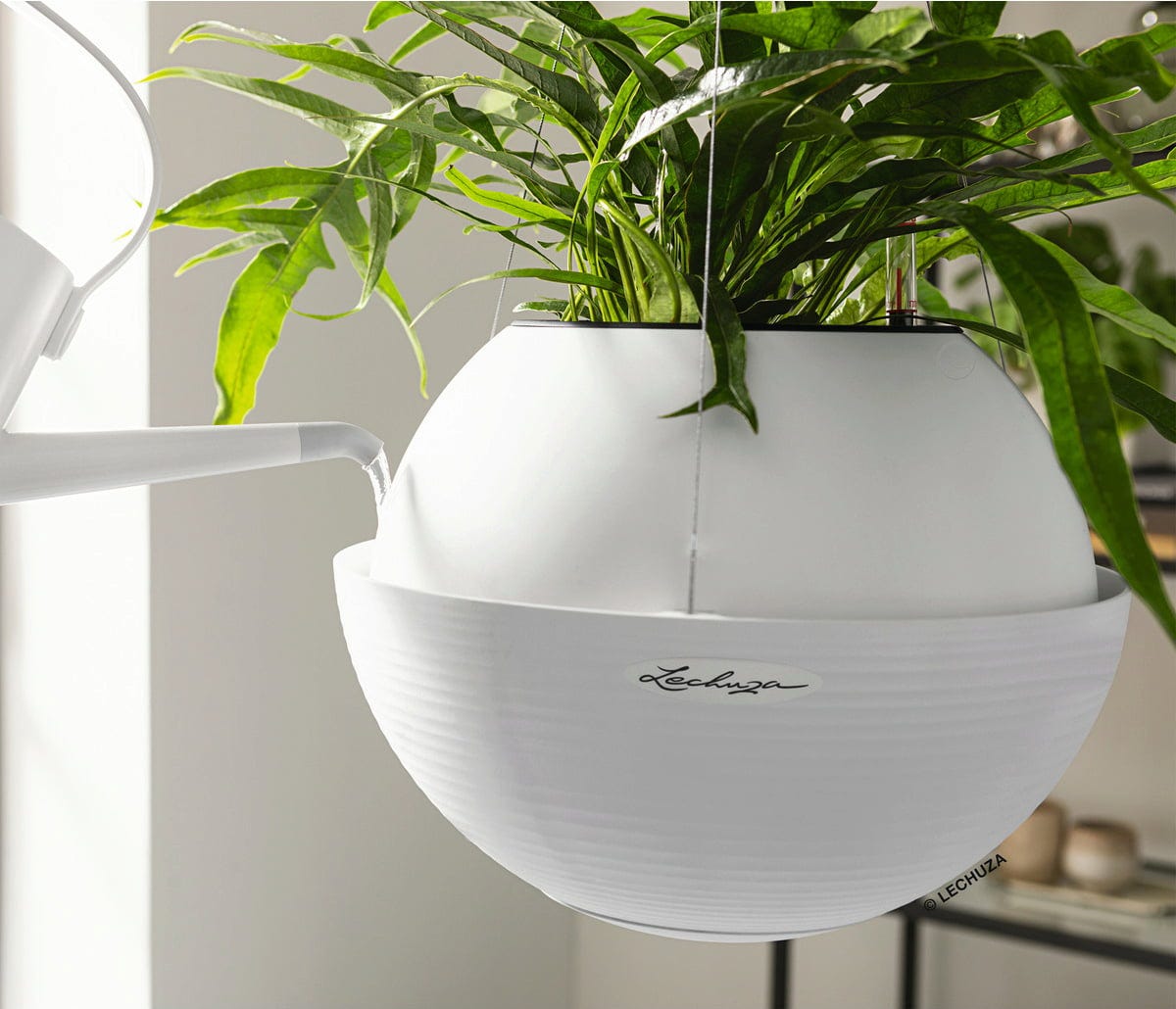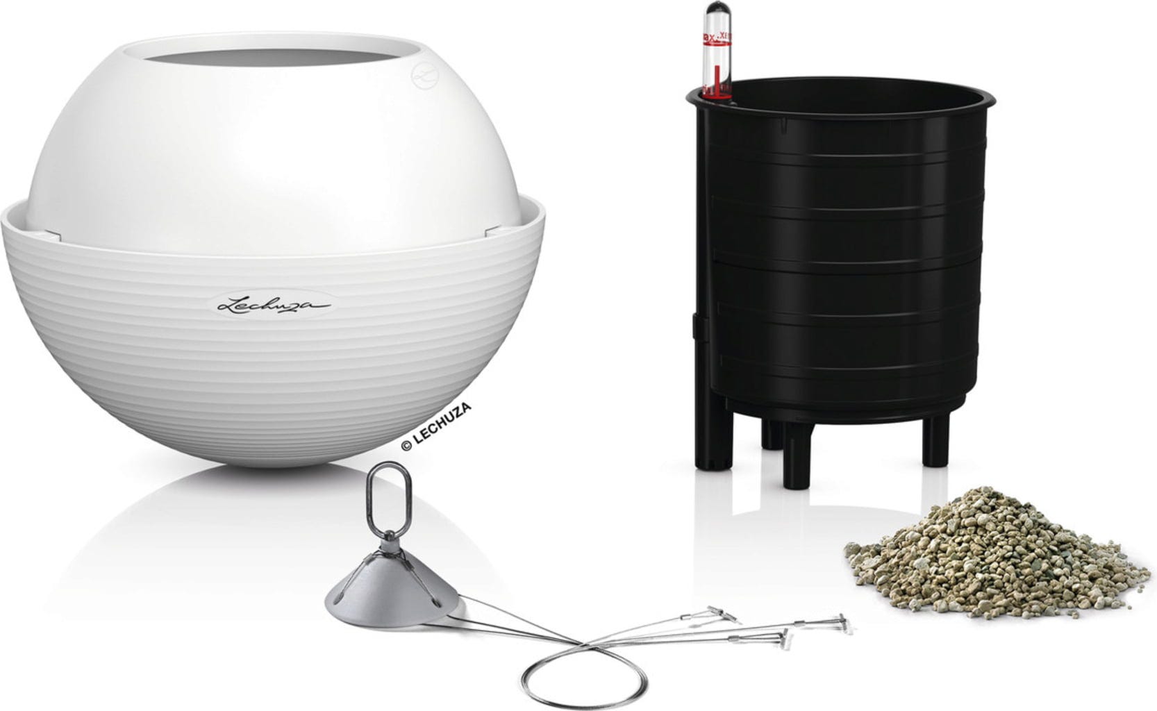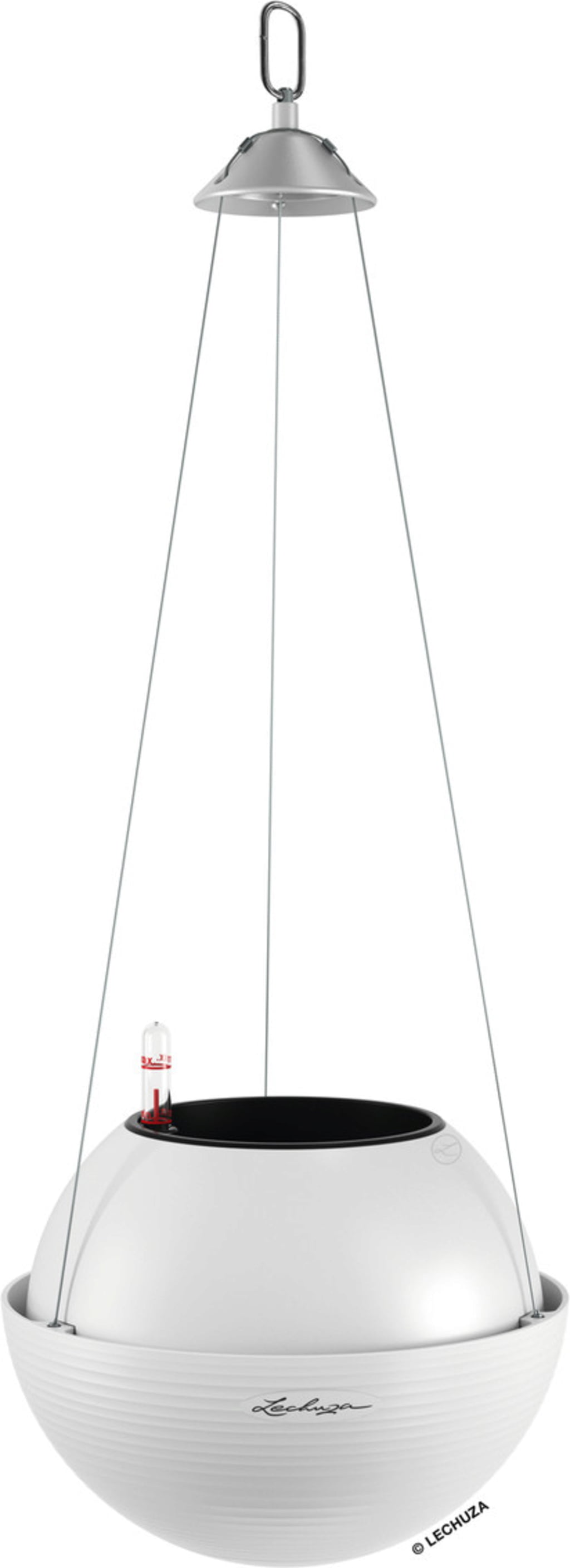 Szállítási csomag: "All-in-One" szett, amely egy virágtartóból, kivehető betétből, Lechuza öntözőszettből és nemesacél felfüggesztésből áll