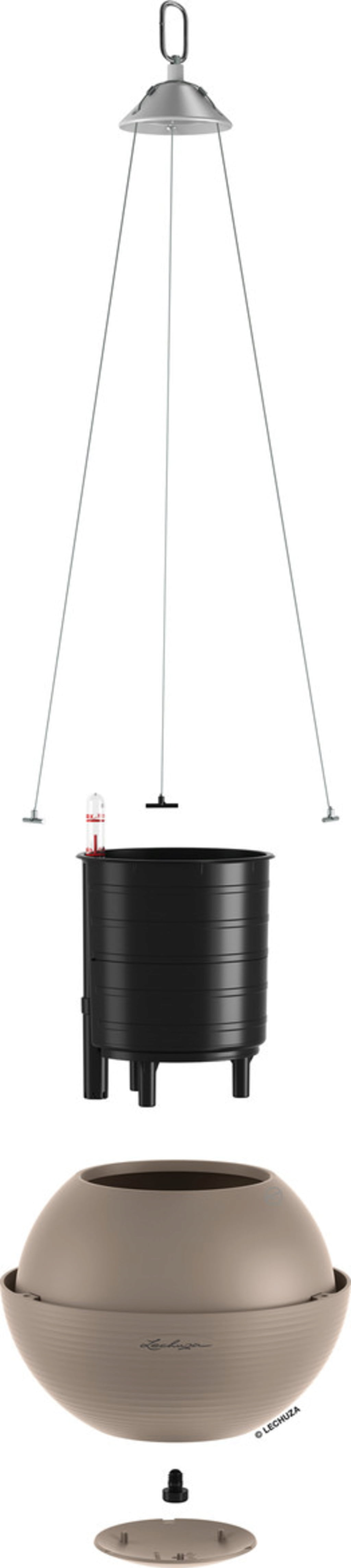 Szállítási csomag: "All-in-One" szett, amely egy virágtartóból, kivehető betétből, Lechuza öntözőszettből és nemesacél felfüggesztésből áll
